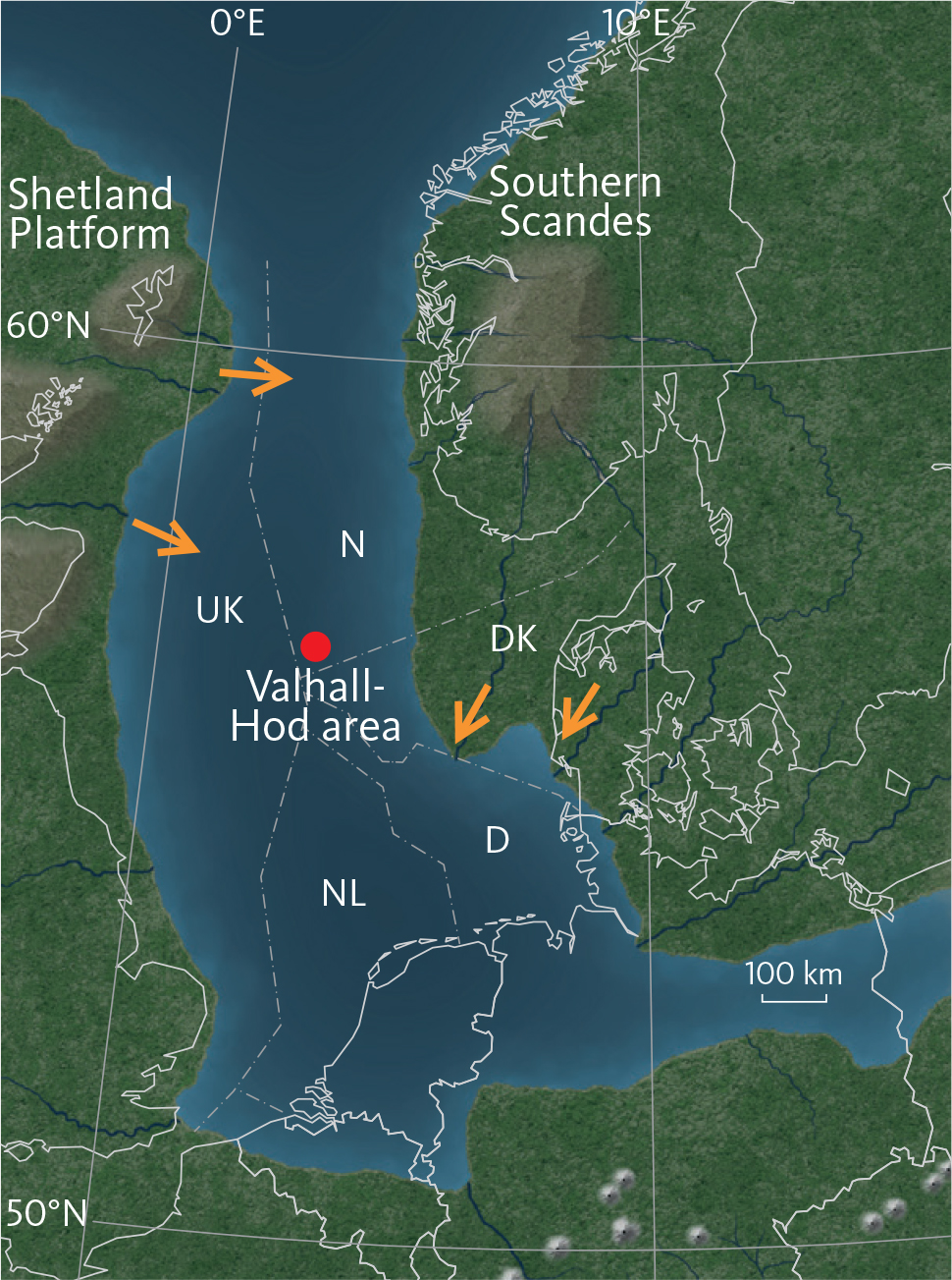 Fig. 1 Palaeogeography of the North Sea area in the Early Miocene. The red dot indicates the location of the study area. Arrows indicate sediment influx. The Valhall/Hod area was located in the central part of the basin. North Sea sectors are as follows: D: Germany. DK: Denmark. N: Norway. NL: Netherlands. UK: United Kingdom. Modified from Rasmussen et al. (2008).