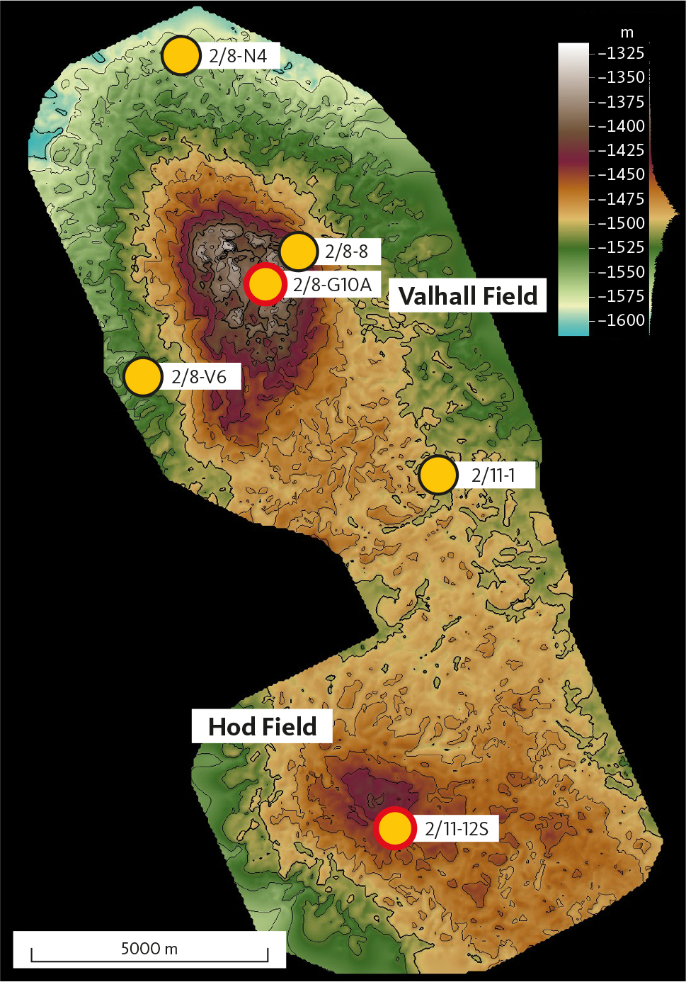 Fig. 2 Depth map to the top Miocene of the Valhall and Hod structures and locations of the six studied wells (yellow dots). Wells circled in red are cored. Credit: Aker BP.