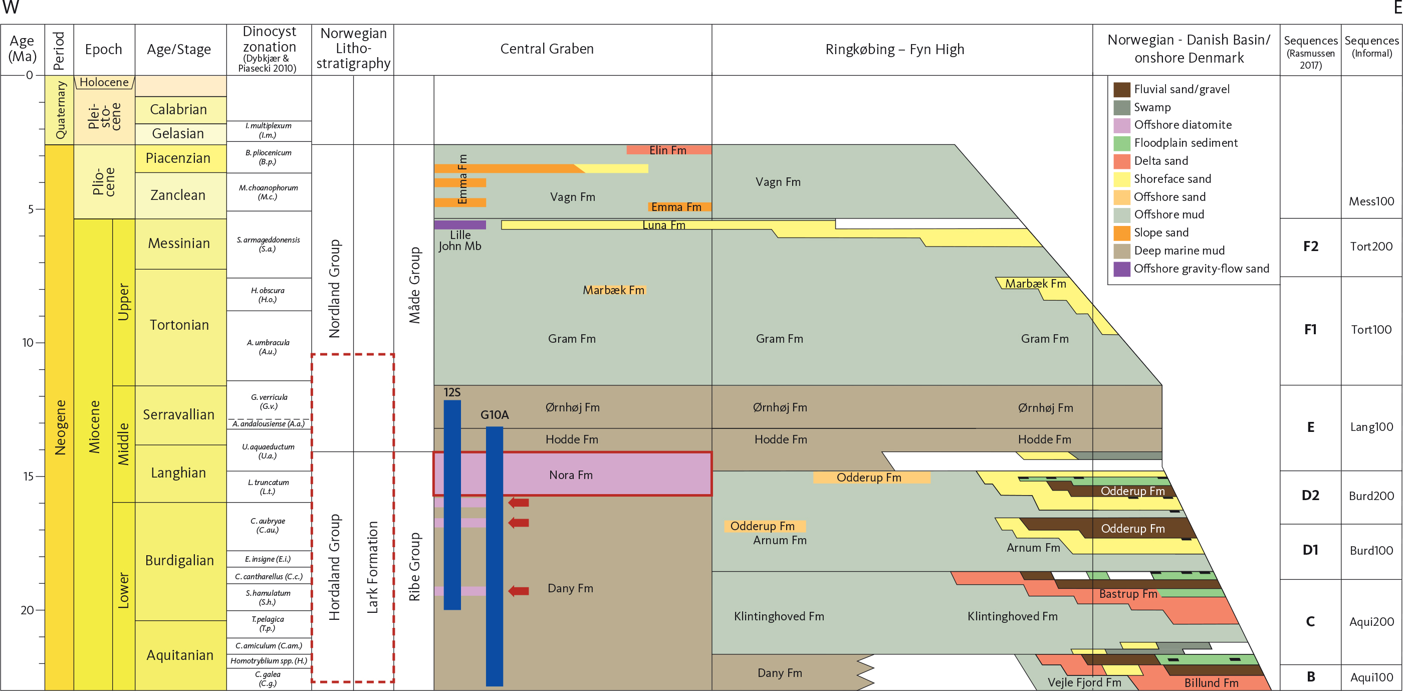 The most comprehensive Sr-isotope study of the Miocene North Sea Basin is that of Eidvin et al. (2014b) from onshore Denmark. The results of that study generally supported the ages of the dinocyst zones of Dybkjær & Piasecki (2010) in the Early Miocene but also documented the uncertainty of using Sr-isotopes for dating this stratigraphic level, especially the late Middle to Late Miocene part of the succession.