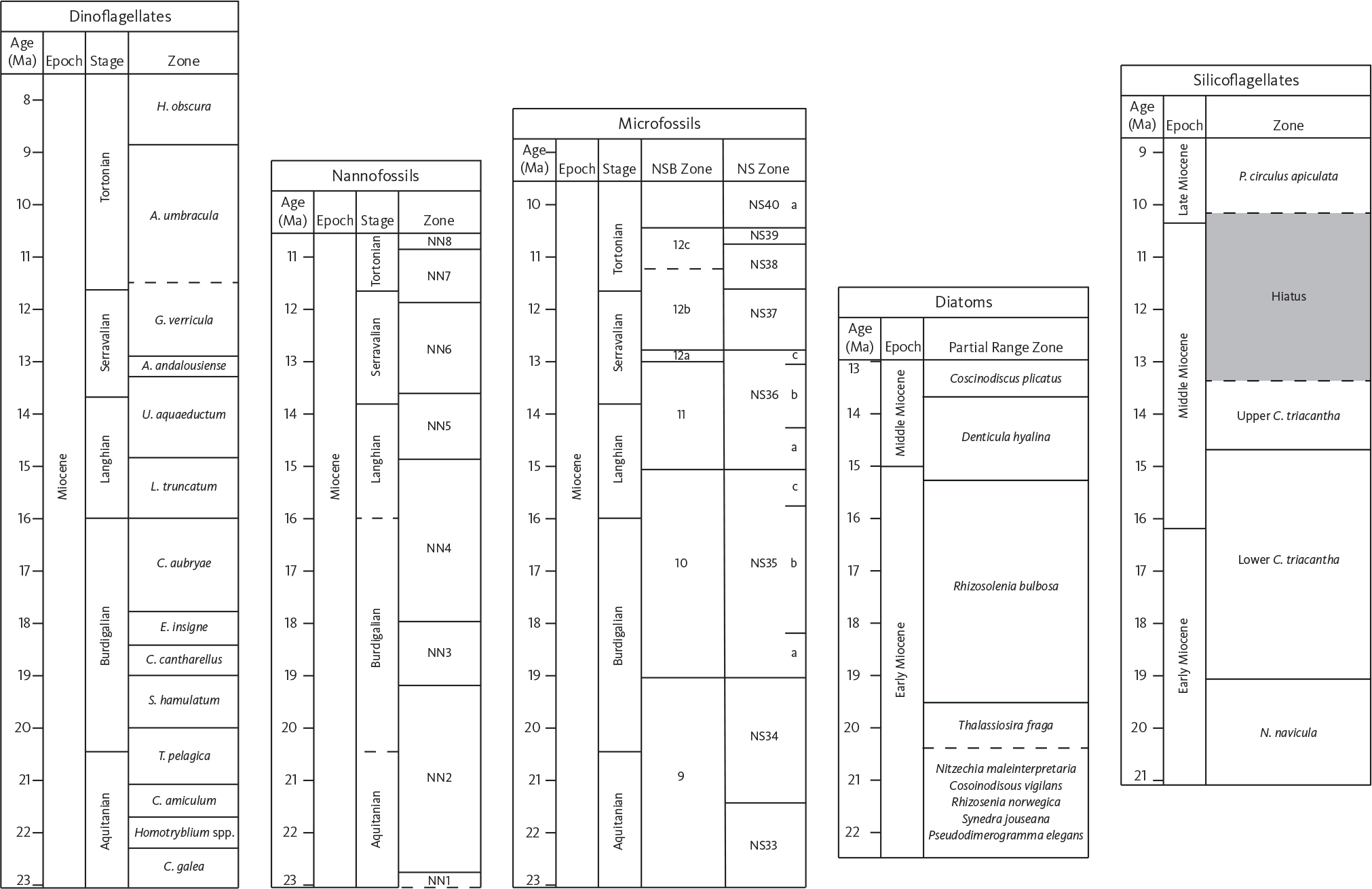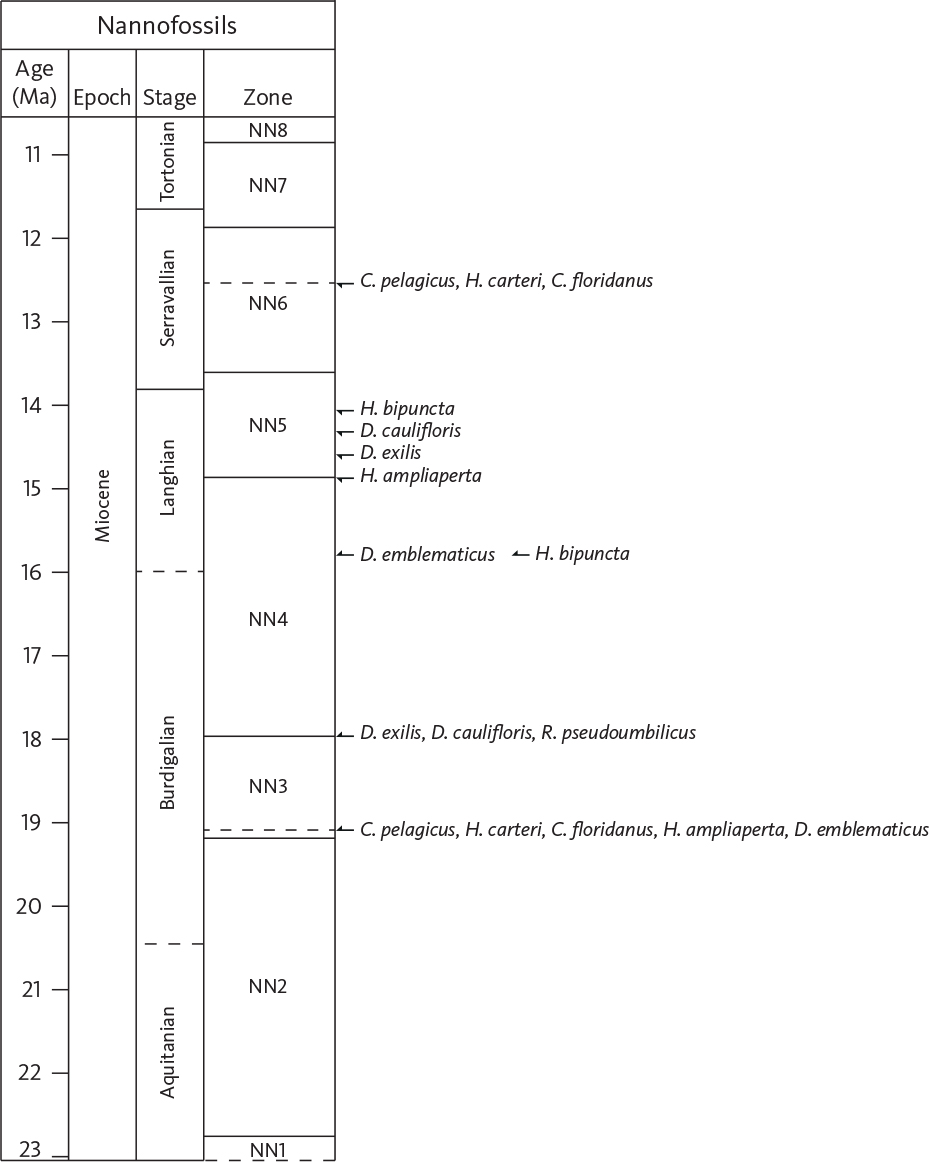 The studied interval spans the Chiropteridium galea Zone to the Hystrichosphaeropsis obscura dinocyst Zone (Dybkjær & Piasecki 2010), the NSB9 (NS34) to NSB12c (NS38–39) microfossil zones (King 1989, 2016), nannofossil zones NN3–NN6 (Martini 1971), the Rhizosolenia norwegica–Coscinodiscus vigilans–Nitzschia maleinterpretaria joint PRZ to the Denticulopsis hyalina PRZ (diatoms, Schrader & Fenner 1976) and the lower and upper Corbisema triacantha silicoflagellates Zones (Locker & Martini 1989).