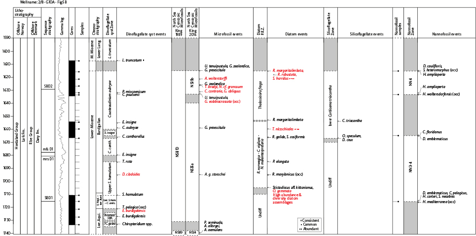 The study was performed combining five biostratigraphic groups: dinoflagellate cysts (dinocysts), microfossils (primarily foraminifera but also including large diatoms and Bolboforma), small fraction diatoms, silicoflagellates and calcareous nannofossils, mostly on the same series of closely spaced sediment samples. This is the first time, to our knowledge, that a detailed North Sea Miocene biostratigraphic study includes small siliceous diatoms and silicoflagellates.
