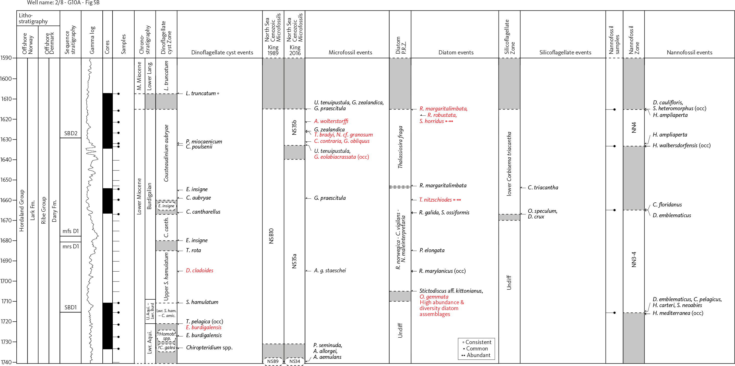 Fig. 5 Summary diagram for the 2/8–G10A well with biostratigraphic zones, previously published events (black text) and new events (red text), for full fossil names see Supplementary File S1. Lithostratigraphy for the Norwegian Sector from Eidvin et al. (2022), onshore Denmark from Rasmussen et al. (2010) and offshore Denmark from Rasmussen et al. (in press). Sequence stratigraphy from Rasmussen (2004a; 2017) and Dybkjær et al. (2021). Gamma log c/o Aker BP. Cored intervals are indicated. The main sample column indicates samples for dinocysts, microfossils, diatoms and silicoflagellates. Nannofossil samples are indicated separately. In the ‘Cores’ column, core samples are marked with a dash-dot symbol, and ditch cutting samples are marked with a dash. Chronostratigraphy of Raffi et al. (2020), dinocyst zonation of Dybkjær and Piasecki (2010), microfossil zonations of King (1989; 2016), diatom zonation of Schrader and Fenner (1976), silicoflagellate zonation of Locker and Martini (1989) and nannofossil zonation of Martini (1971). *: Late Miocene, **: late Tortonian, ***: Hystrichosphaeropsis obscura zone. FM: Formation. M.M. and M. Micoene: Middle Miocene. Ser.: Serravallian. Lang.: Langhian. P.R.Z.: Partial Range Zone. U.: Upper. Lwr.: Lower. Aqui.: Aquitanian. Burd.: Burdigalian. Undiff.: Undifferentiated.