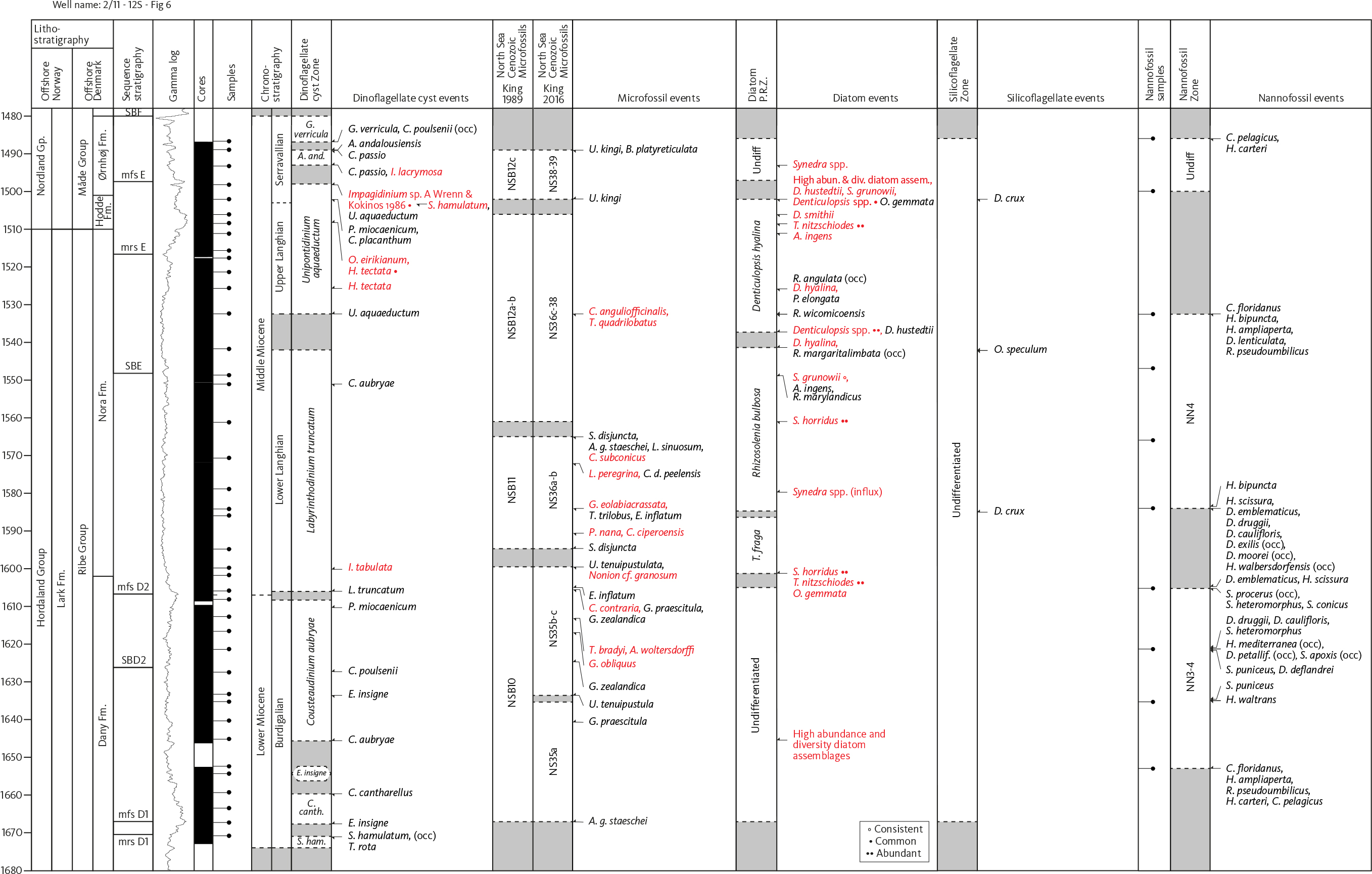 Fig. 6 Summary diagram for the 2/11–12S well with biostratigraphic zones, previously published events (black text) and new events (red text), for full fossil names see Supplementary File S2. Lithostratigraphy for the Norwegian Sector from Eidvin et al. (2022), onshore Denmark from Rasmussen et al. (2010) and offshore Denmark from Rasmussen et al. (in press). Sequence stratigraphy from Rasmussen (2004a; 2017) and Dybkjær et al. (2021). Gamma log c/o Aker BP. Cored intervals are indicated. The main sample column indicates samples for dinocysts, microfossils, diatoms and silicoflagellates. Nannofossil samples are indicated separately. Core samples are marked with a dash with a dot, and ditch cutting samples are marked with a dash. Chronostratigraphy of Raffi et al. (2020), dinocyst zonation of Dybkjær and Piasecki (2010), microfossil zonations of King (1989, 2016), diatom zonation of Schrader and Fenner (1976), silicoflagellate zonation of Locker and Martini (1989) and nannofossil zonation of Martini (1971). FM: Formation. Undiff.: Undifferentiated.
