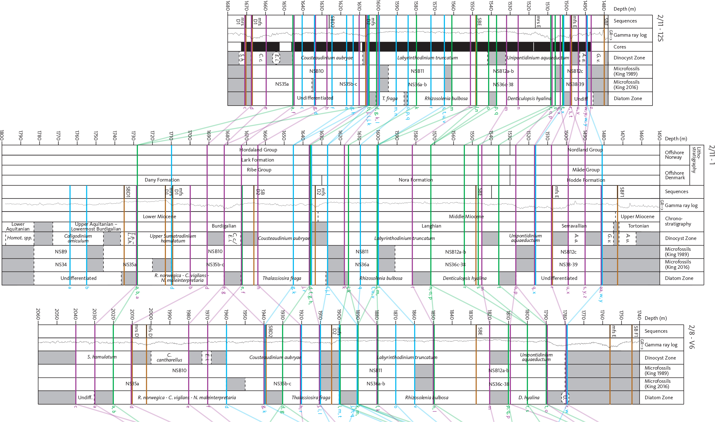 Fig. 8 Multidisciplinary biostratigraphic correlation diagram of the six studied wells, from south to north, from the Hod Field to the Valhall Field using dinocyst, microfossil and diatom events. Events are correlated using coloured correlation lines and are denoted using a letter as follows: Dinocysts (purple lines): a: FO Sumatradinium hamulatum, b: LO Dinopterygium cladoides, c: LO Thalassiophora rota, d: FO Exochosphaeridium insigne, e: LO Cordosphaeridium cantharellus, f: FO Cousteaudinium aubryae, g: LO Exochosphaeridium insigne, h: FO Cerebrocysta poulsenii, i: FO Palaeocystodinium miocaenicum, j: FO Labyrinthodinium truncatum, k: FO Invertocysta tabulata, l: LO Cousteaudinium aubryae, m: FO Unipontidinium aquaeductum, n: FO Habibacysta tectata, o: FO Habibacysta tectata (common), p: FO Operculodinium erikanium, q: LO Cleistosphaeridium placacanthum, r: LO Unipontidinium aquaeductum, s: LO Sumatradinium hamulatum, t: FO Impagidinium sp A Wrenn & Kokinos 1996 (common), u: FO Invertocysta lacrymosa, v: FO Cannosphaeropsis passio, w: LO Cannosphaeropsis passio, x: LO Palaeocystodinium miocaenicum, y: FO Achomosphaera andalousiensis, z: FO Grammocysta verricula, aa: FO Amiculosphaera umbracula. Microfossils (blue lines): a: LO Plectofrondicularia seminuda, b: LO Aulacodiscus allorgei, c: FO Globorotalia praescitula, d: FO Uvigerina tenuipustulata, e: LO Globigerinoides obliquus, f: FO Globorotalia zealandica, g: LO Trifarina bradyi, h: LO Alabamina wolterstorffi, i: LO Ceratobulimina contraria, j: LO Globorotalia zealandica, k: LO Globorotalia praescitula, l: LO Uvigerina tenuipustulata, m: LO Paragloborotalia nana, n: LO Ciperoella ciperoensis, o: LO Trilobatus trilobus, p: LO Globoturborotalita eolabiacrassata, q: LO Elphidium inflatum, r: LO Lenticulina peregrina, s: LO Cancris subconicus, t: LO Loxostomum sinuosum, u: LO Sphaeroidinellopsis disjuncta, v: LO Asterigerina guerichi staeschei, w: LO Bolboforma platyreticulata, x: FO Uvigerina kingi, y: LO Uvigerina kingi. Diatoms (green lines): a: FO High abundance and diversity diatom assemblages, b: FO Opephora gemmata, c: FO Stictodiscus aff. kittonianus, d: FO Thalassionema nitzschiodes (common to abundant), e: FO Raphoneis margaritalambata, f: LO Raphoneis margaritalambata, g: FO Stephanopyxis horridus (common to abundant), h: FO Raphoneis robustata, i: FO Rhizosolenia miocenca, j: FO Cymatosira biharensis, k: FO Synedra spp. (influx), l: FO Stephanopyxis grunowii, m: LO Stephanopyxis horridus (common to abundant), n: FO Actinocyclus ingens, o: FO Denticulopsis hyalina, p: FO Denticulopsis spp. (common to abundant), q: FO Denticulopsis hustedtii, r: LO Thalassionema nitzschiodes (common to abundant), s: LO Diploneis smithii, t: LO High abundance and diversity diatom assemblages (including A. ingens, Denticulopsis spp., O. gemmata, S. grunowii, S. aff. kittonianus, Synedra spp.). Sequence boundary correlations are marked in brown. The datum line for the correlation is sequence boundary SBE. Lithostratigraphy for the Norwegian Sector from Eidvin et al. (2022), onshore Denmark from Rasmussen et al. (2010) and offshore Denmark from Rasmussen et al. (in press). Sequences from Rasmussen (2004a; 2017) and Dybkjær et al. (2021). Gamma (GR) log c/o Aker BP. Cored intervals are indicated. Chronostratigraphy of Raffi et al. (2020), dinocyst zonation of Dybkjær & Piasecki (2010), microfossil zonations of King (1989, 2016) and diatom zonation of Schrader & Fenner (1976). Dinocyst zone abbreviations: A. a.: Achomosphaera andalousiensis, A. u.: Amiculosphaera umbracula, C. a.: Caligodinium amiculum, C. c.: Cordosphaeridium cantharellus, C. g.: Chiropteridium galea, E. i.: Exochosphaeridium insigne, G. v.: Gramocysta verricula, H. s.: Homotryblium spp., L. S. h.: Lower Sumatradinium hamulatum, S. h.: Sumatradinium hamulatum, T. p.: Thalassiphora pelagica, U. S. h.: Upper Sumatradinium hamulatum, ***: Hystrichosphaeropsis obscura, U.: undifferentiated. Grey shading denotes no information. A full-sized version of this figure is available as Supplementary File S13.