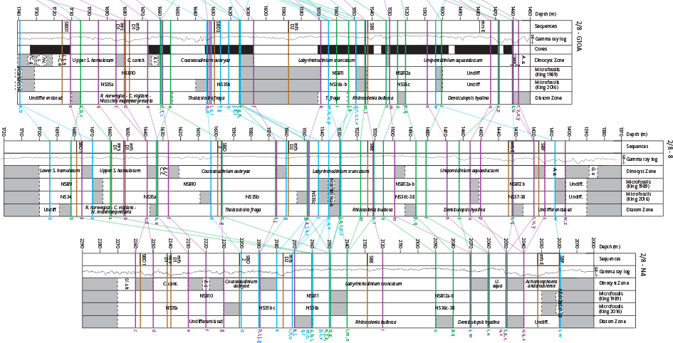 Observations. It was not possible to subdivide these three PRZs in this study. In the 2/8–G10A core, the base of this combined interval was based on the FO of Stictodiscus aff. kittonianus and the top by the FO of Raphoneis margaritalimbata. The FO of Stictodiscus aff. kittonianus is found with the FO of Opephora gemmata in the upper Sumatradinium hamulatum dinocyst Zone in the 2/8–G10A core. The FO of Opephora gemmata is found at a similar stratigraphic level in the 2/8–8, 2/8–V6 and 2/11–1 wells and is here used as an additional diatom event for the identification of the base of the R. norwegica–C. vigilans–N. maleinterpretaria joint PRZ. The top of this joint PRZ is marked by the FO of Raphoneis margaritalimbata in the 2/8–G10A, 2/8–8 and 2/11–1 wells (Figs. 5, 8, Supplementary Files S1, S4, S6, S7, S10, S12, S13), close to the FO of the dinocyst Cousteaudinium aubryae. The top of this PRZ in the 2/8–V6 well (Supplementary Files S5, S11) is comparatively high, but due to a lack of other marker diatoms is based on the FO of common to abundant Stephanopyxis horridus in the overlying sample, an event which is characteristic of the overlying Thalassiosira fraga PRZ. The R. norwegica–C. vigilans–N. maleinterpretaria joint PRZ is only identified in the 2/8–G10A, 2/8–8, 2/8–V6 and 2/11–1 wells.