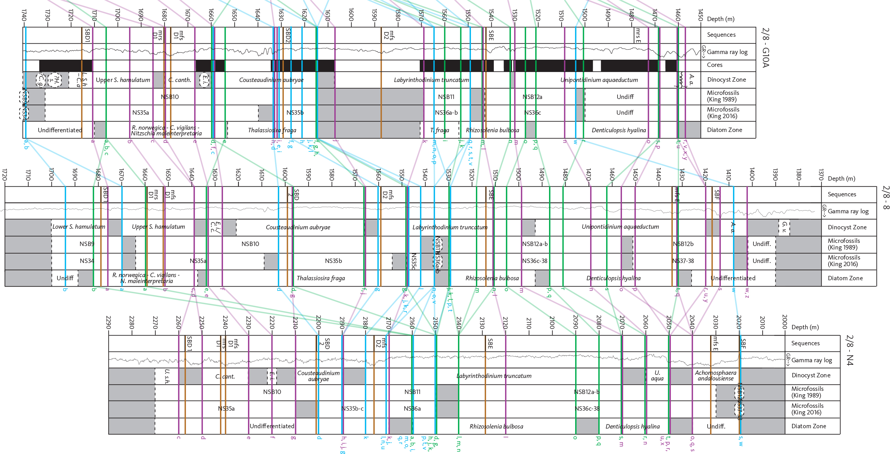 Supplementary Files S7–S12.pdf include correlation lines Fig. S7 Biostratigraphic summary diagram for the 2/8–G10A well, Fig. S8 Biostratigraphic summary diagram for the 2/11–12S well, Fig. S9 Biostratigraphic summary diagram for the 2/8–N4 well, Fig. S10 Biostratigraphic summary diagram for the 2/8–8 well, Fig. S11 Biostratigraphic summary diagram for the 2/8–V6 well and Fig. S12 Biostratigraphic summary diagram for the 2/11–1 well.