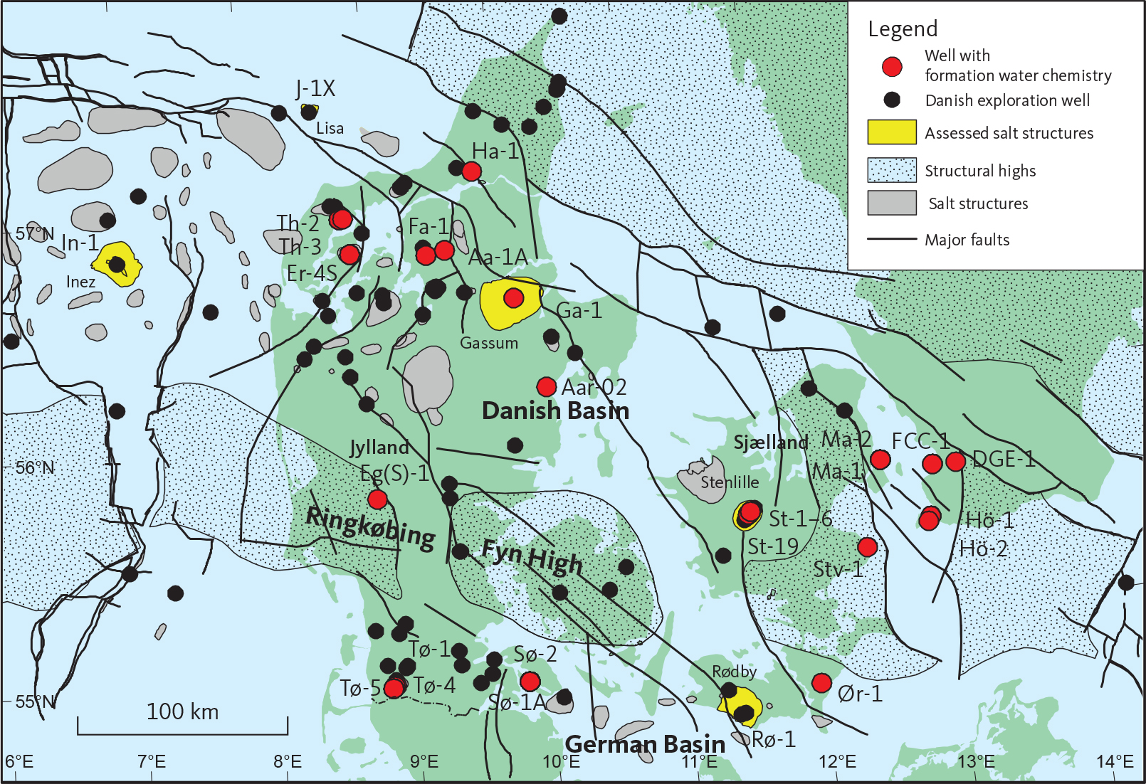 In this study, we use existing databases to conduct assessments of various Mesozoic structures that formed part of the GEUS-led Carbon Capture and Storage study, CCS2022–2024, focused on maturing potential CO2 storage sites (Gregersen et al. 2023, 2025; Fig. 1). The objective is to assess the key physical properties of the formation water including its temperature, pressure, salinity (Cl and total dissolved solids (TDS)) and density, to discuss the effects hereof on the CO2 storage efficiency and hence to highlight injection risks. In order to evaluate salinities in structures and reservoir levels where no water analyses are available, we have developed a methodology based on the well-documented depth dependencies identified in previous research (Laier 1989a, 2008; Holmslykke et al. 2019) that aims to refine our predictions by aligning them more closely with the specifics of the local geology using the methodology presented in Schovsbo et al. (2020). We use the term ‘reservoir’ here as an informal zone of a lithostratigraphical unit to describe a porous unit suitable for CO2 storage.