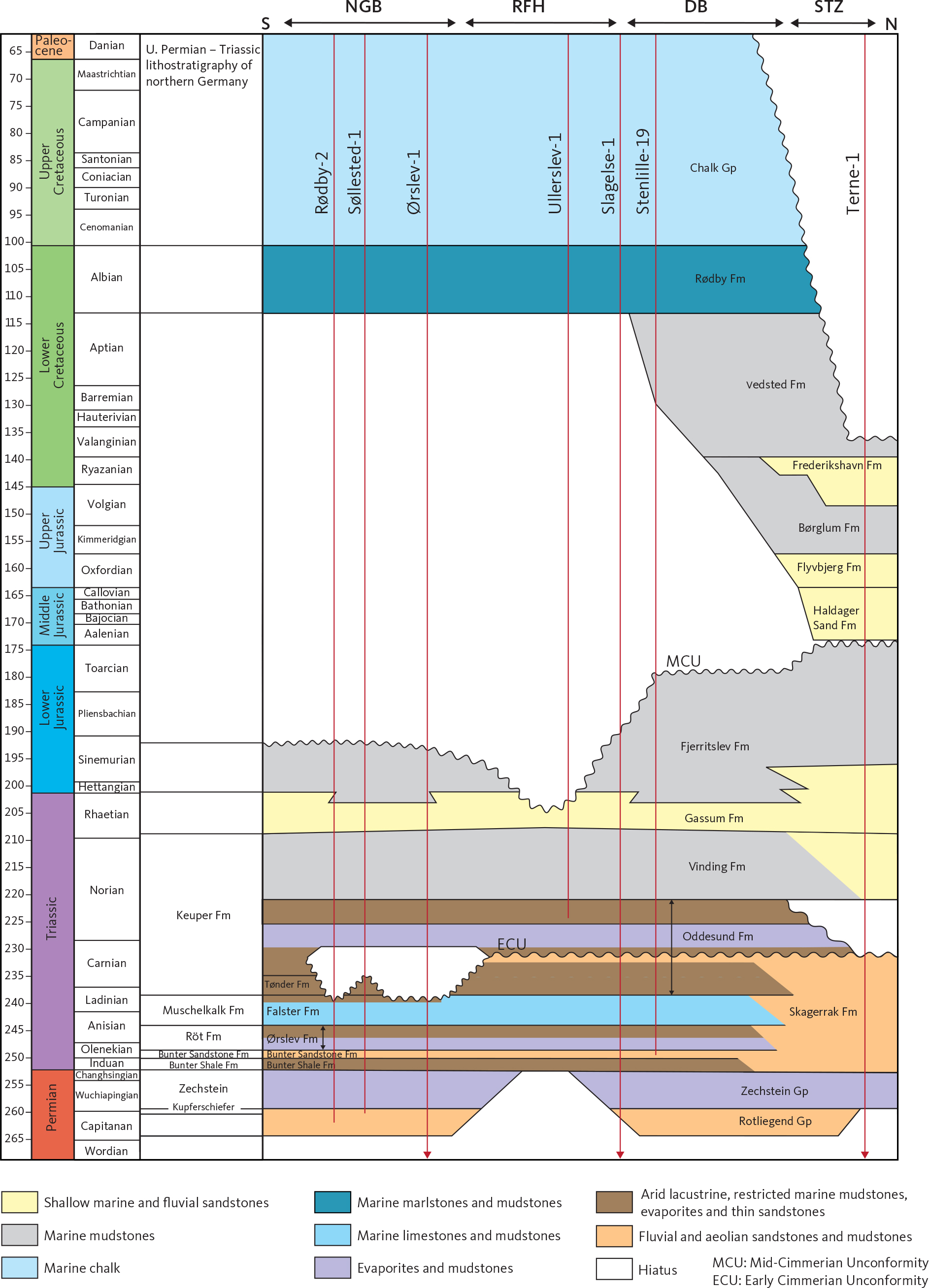 The structural configurations of the Danish Basin and the North German Basin (Fig. 1) were established during the early Permian (Michelsen et al. 2003). In the central part of the Danish Basin, the post mid-Permian succession attains thicknesses up to 9000 m (Fig. 3D). The upper Permian succession (Zechstein Group) is characterised by extensive evaporite deposits, particularly in the major depocentres, with carbonate upon and fringing paleo highs (Ziegler 1990; Geluk 2000; Fig. 3A). Evaporite accumulation waned in the earliest Triassic, when sedimentation of non-marine siliciclastics dominated the area, but resumed in the late Early Triassic. In the North German Basin, evaporites accumulated during the extensional tectonics of the Hardegsen phase, forming the Röt Basin in the latest Early Triassic (Kovalevych et al. 2002; Fig. 3B). In Denmark, correlative deposits are represented by the Ørslev Formation (Fig. 2), an evaporitic claystone unit that includes rock salt (mostly halite) deposits in the deeper parts of the basin (Bertelsen 1980). The northern limit of the halite facies in the Ørslev Formation towards the Ringkøbing–Fyn High is somewhat uncertain but has been re-evaluated based on well logs and cuttings during the preparation of the Geothermal WebGIS Portal and likely extend north up to the Ringkøbing Fyn High (see Vosgerau et al. 2016; Fig. 3B).