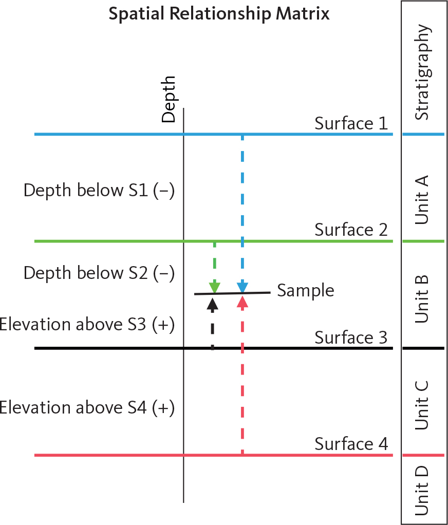 Fig. 5 Principle of the Spatial Relationship Matrix (SRM). The transformation expresses the sample depth relative to a specific surface by calculating its depth above (positive value) or below (negative value) the datum. Consequently, a sample in a well with ‘n’ identified surfaces will have n depths. S1: Surface 1. S2: Surface 2. S3: Surface 3. S4: Surface 4.