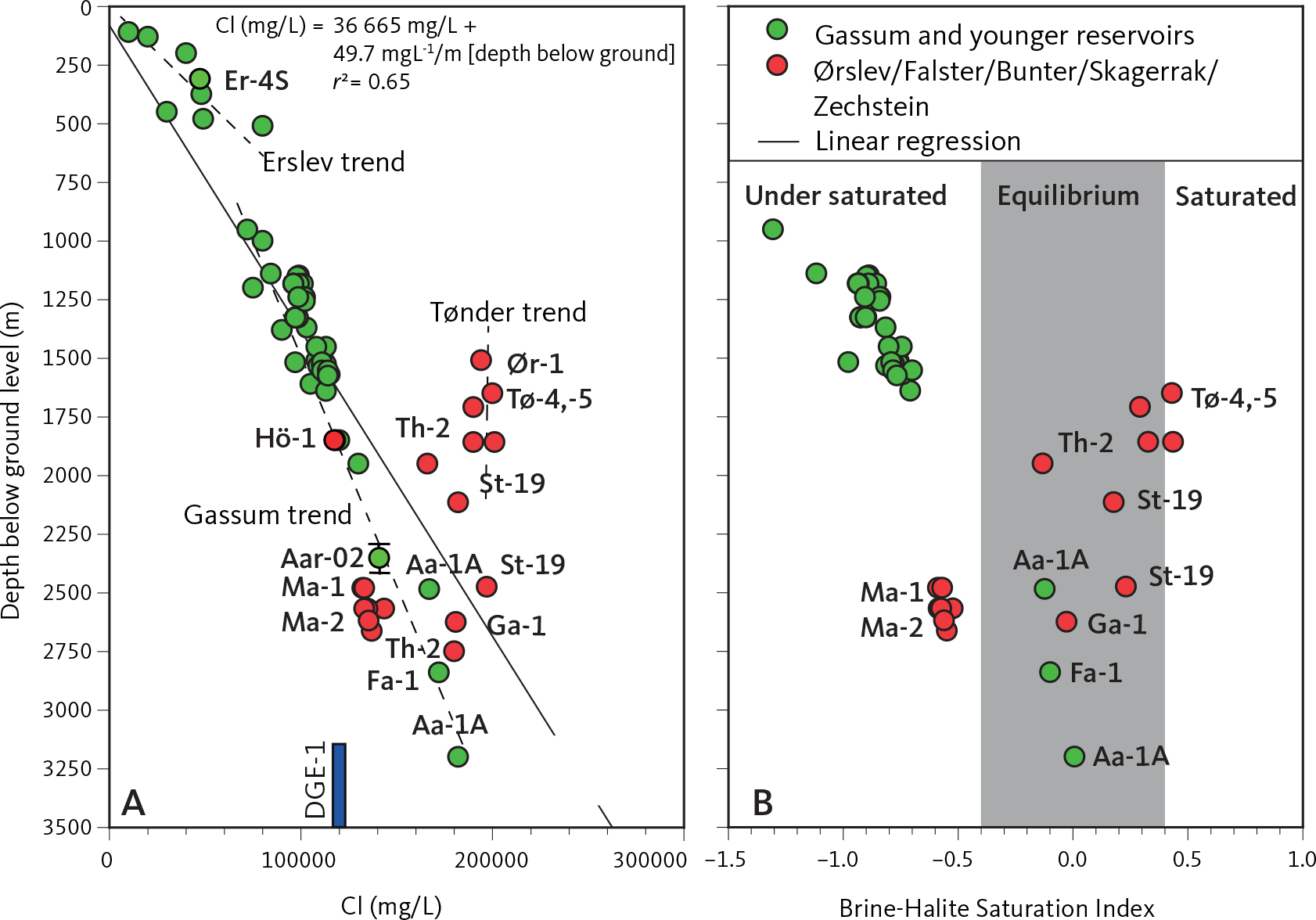 Fig. 6 Chloride concentrations versus present day depth below ground level (A) and Brine-halite (NaCl) Saturation Index (SINaCl) at reservoir conditions (B). Thermodynamic equilibrium for halite (–0.4 ≤ SINaCl ≤ 0.4) is illustrated with a grey band. Well abbreviations as Fig. 1. Broken lines in A indicate sub-trends discussed in the text. The DGE-1 well tested crystalline basement between 3198 and 3702 m of depth. Aarhus-02 (Aar-02) tested the interval 2293–2411 m.