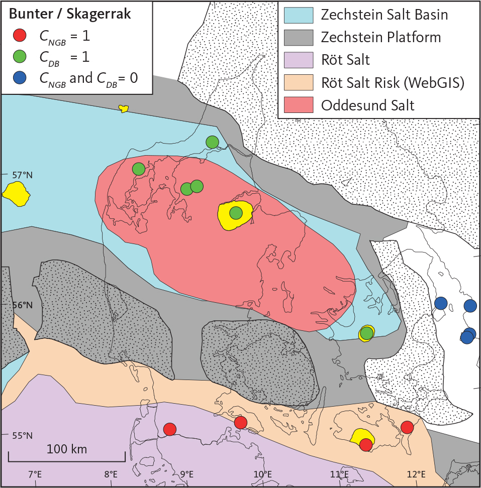 Fig. 7 Assignment of the categorial contribution variables for North German Basin (CNGB) and Danish Basin (CDB) for the PLS regression analysis of Zechstein, Bunter Sandstone, Ørslev, Falster and Skagerrak brine samples. A value of 1 indicates the likely presence of interbedded rock salt and a value of 0 indicates the likely absence. Assessed potential CO2 structures (yellow) and wells are after Fig. 1.