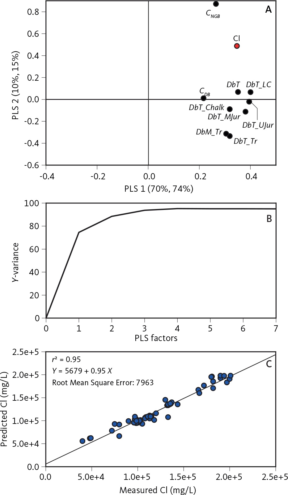 Fig. 8 PLS-regression model for chloride concentrations (red) and stratigraphic and geologic parameters [SRM, CNGB, CDB] variable set (black dots). (A) loading-weights plot (w1–w2); proportions of total data variance modelled shown along each PLS component [X%, Y%]. (B) modelled y-variance and (C) prediction versus reference plot. Proportions of total data variance (PLS factor 3) modelled shown along each PLS component [X%, Y%]. Categorial contribution variables for North German Basin (CNGB) and Danish Basin (CDB). CL: chloride. Other abbreviations after Table 1.