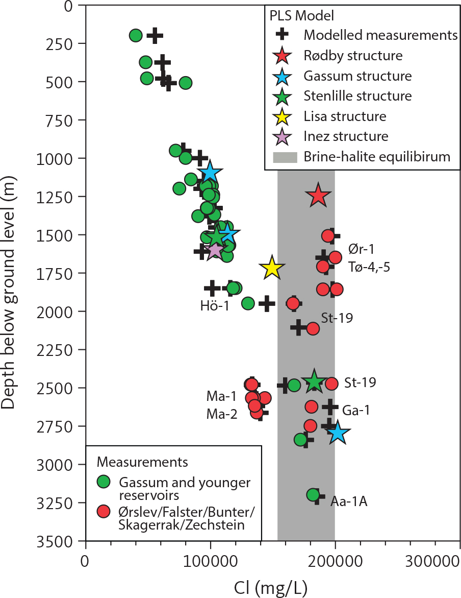 Applying the PLS regression model with the Gassum-1 stratigraphy as input, it is estimated that at the depth of the Frederikshavn Formation, situated at approximately 1095 m, the brine has a chloride concentration of 99 400 mg/L (equivalent to 164 700 mg/L TDS). Within the primary reservoir of the Gassum Formation, located at roughly 1550 m below ground level, the estimated salinity reaches approximately 115 200 mg/L Cl (190 700 mg/L TDS). Meanwhile, at the depth of the Skagerrak sandstone reservoir, around 2800 m, salinity is estimated to be approximately 201 800 mg/L Cl (334 100 mg/L TDS) with a density of 1.23 kg/L. The influx at 2625 m in the Ørslev Formation is modelled to have a Cl level of 195 000 mg/L, which is 15 000 mg/L higher than measured values of 180 770 mg/L Cl, 287 986 mg/L TDS. Given the uncertainties with the depth of the influx and modelling, this seems reasonable.