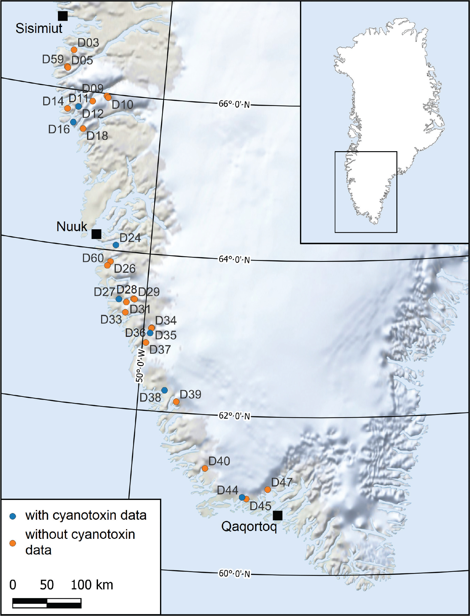 Fig. 1 Map of south-western Greenland with sample locations. Blue sites include cyanotoxin data, while orange sites do not. Black squares: towns/settlements.