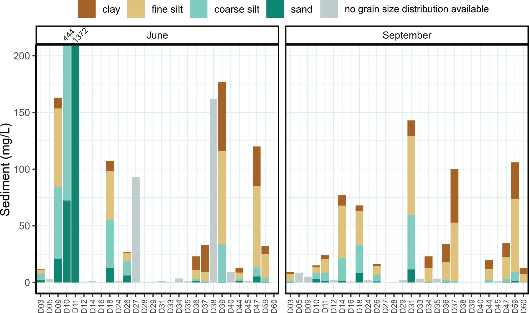Fig. 2 Sediment concentration (mg/L) and composition (clay, fine silt, coarse silt and sand, available only when sediment content was >10 mg/L) in meltwater rivers in June and September. D38, D39 and D40 were not sampled in September. Note that some low concentration samples may be difficult to distinguish from the background line. To improve readability of the figure, the upper limit of the y-axis was set to 200 mg/L. In June, sites D10 and D11 had a total sediment concentration of 444 and 1372 mg/L, respectively. Grain-size composition was not measured in 2017, hence there are no composition data for sites D27 and D38 in June despite their high sediment concentrations.