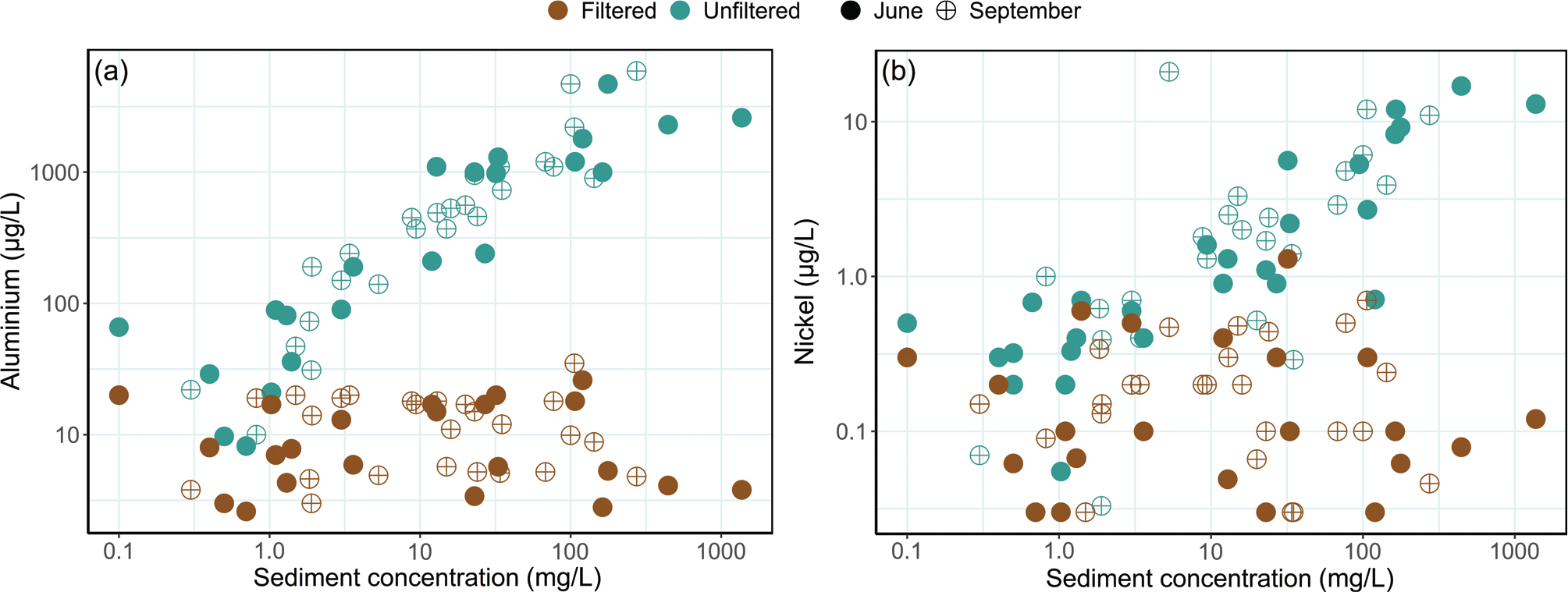 Supplementary File S2 shows elevated aluminium, nickel and chromium levels in unfiltered samples, likely due to partial extraction of these elements from sediment particles caused by the nitric acid that was added for preservation. In accordance with this, filtering the samples before the addition of nitric acid significantly reduced these concentrations. Figure 3 highlights correlations between sediment concentrations and aluminium and nickel in filtered and unfiltered samples, with aluminium showing consistent fractions extractable with dilute nitric acid, while for nickel this varies across locations. It should be emphasised, that the extraction was not exhaustive and therefore the extractable concentrations cannot be used to conclude on the total amount of trace metals in the sediment particles.