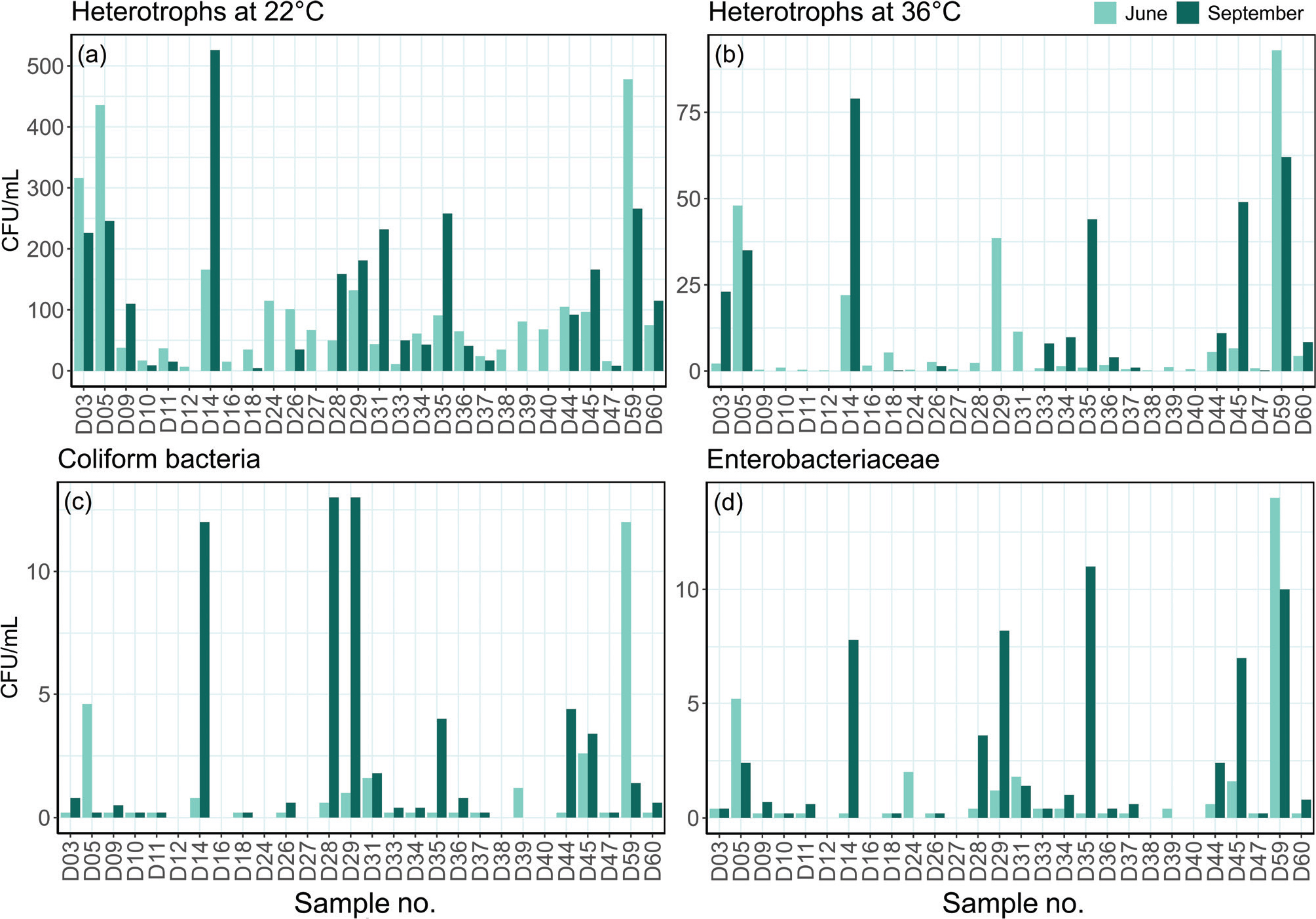 Fig. 4 Bacterial counts as colony forming units (CFU) per mL at the meltwater river sites in June and September for (a) heterotrophs at 22°C, (b) heterotrophs at 36°C, (c) coliform bacteria and (d) Enterobacteriaceae. The detection limit was 0.2 CFU/mL. Notice the differences in y-axis scale.