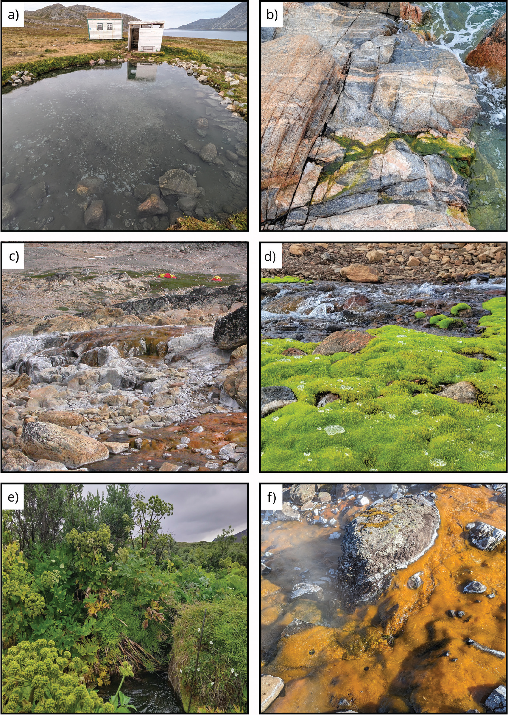 A key characteristic of many thermal springs is the distinctive vegetation hosted within pockets of elevated temperatures forming a mild microclimate around the springs. Near Ittaajimmiit in central East Greenland, vibrant green mosses thrive around the springs (Fig. 2d), and patches dominated by kvan (Angelica archangelica) are common in Sullorsuaq (Kvandalen) on the island of Qeqertarsuaq (Fig. 2e). The effluent channels of many homeothermal springs, especially the East Greenland hot springs, are often covered by colourful, thick microbial biofilms that are dominated by cyanobacteria embedded in exopolymeric substances (Fig. 2f; Kühl et al. 2004; Roeselers et al. 2007; Kühl & Colgan 2025).