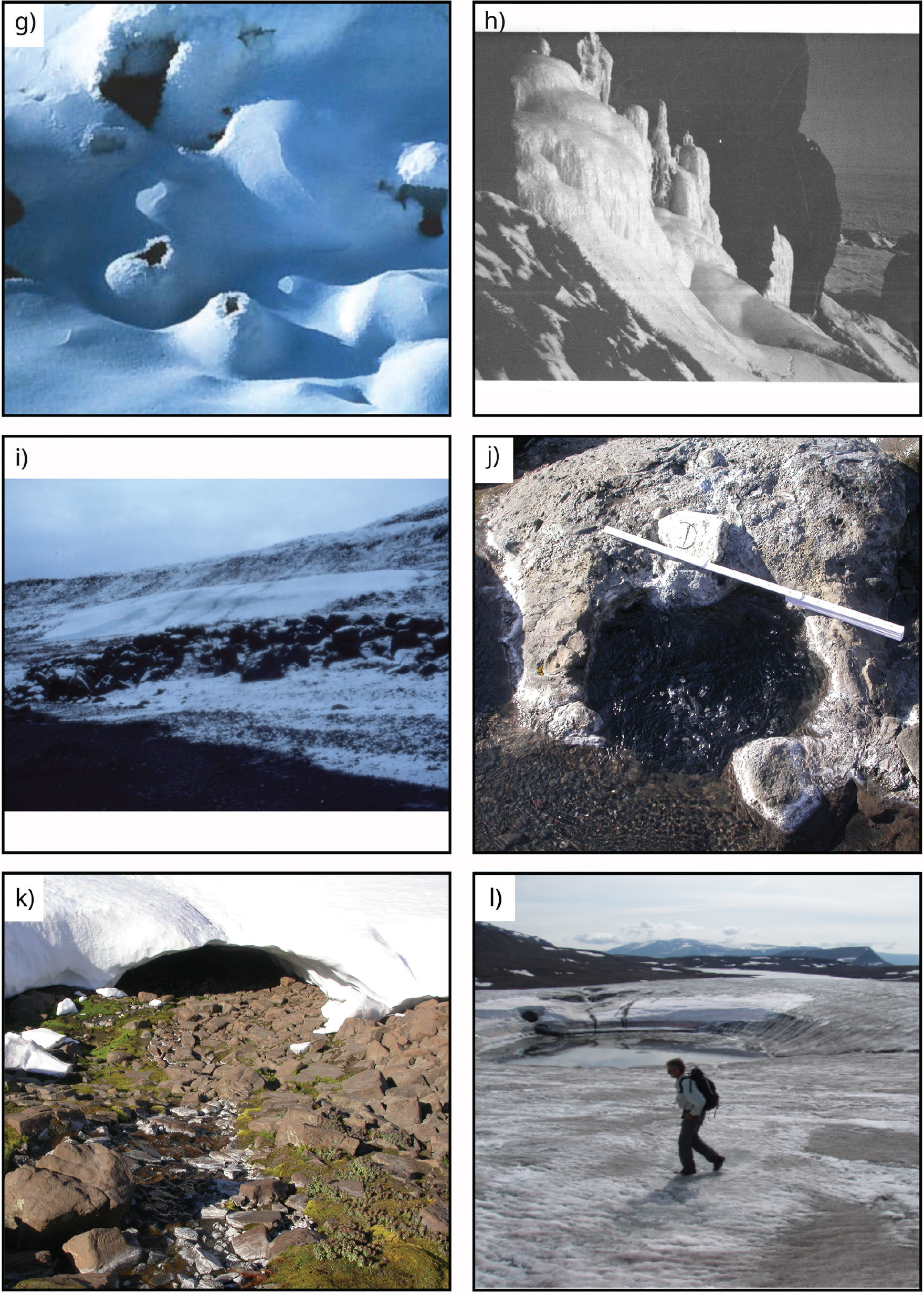 Fig. 2 Overview of spring types. (a): Uunartoq surface pool in South Greenland (Photo: Michael Kühl). (b): Spring water emerging from rock face at Uunataaji near Ittoqqortoormiit in central East Greenland (Photo: Grimur Björnsson). (c): Hot spring emerging out of a hillside in Nørrefjord in central East Greenland with mineral precipitates on the surrounding stones and with the spring bed covered by colorful bacterial mats (Photo: Michael Kühl). (d): Green moss near Ittaajimmiit cold spring in central East Greenland (Photo: Grimur Björnsson). (e): Kvan from Sullorsuaq on Qeqertarsuaq in central West Greenland (Photo: Ylva Sjöberg). (f): Cyanobacterial mats at Knighton Fjord, central East Greenland (Photo: Michael Kühl). (g): Chimney structure in snow from the Uunartorsuaq spring on Qeqertarsuaq in 2000 (Photo: Kristensen 2000). (h) and (i): Seersinneq icing in Serminnguaq on Qeqertarsuaq (Photo: Jon Feilberg). (j): Thermal spring in the intertidal zone in Qalaattiviip Kangersiva (Rømer Fjord) in central East Greenland. The spring is covered by seawater at high tide, and the effluent water contains many gas bubbles, which can also be seen reaching the seawater surface at high tide (Photo: Michael Kühl & Søren Rysgaard). (k): A hot spring emerging from under a patch of snow-cover at the coastline of Qalaattiviip Kangersiva (Photo: Michael Kühl & Søren Rysgaard). (l): Surface depressions on a small glacier at the end of Giesecke Dal on Qeqertarsuaq are hypothesised to be associated with subglacial spring (Photo: Ole Bennike).