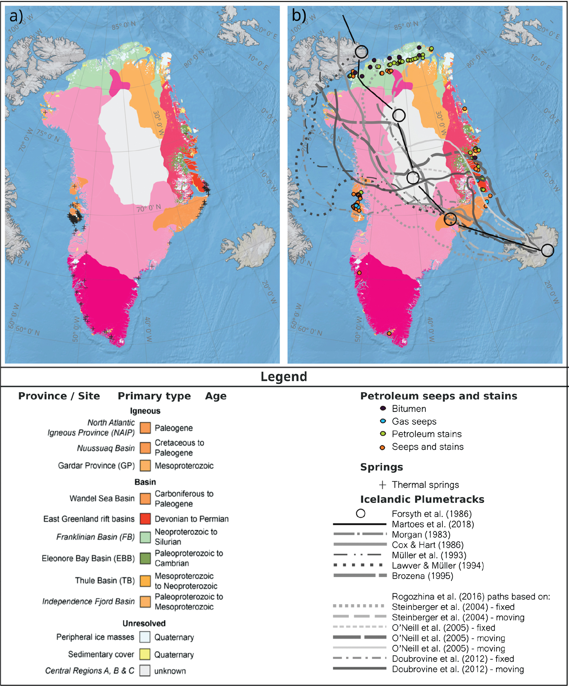 Fig. 6 Greenland subglacial geologic provinces from MacGregor et al. (2024) shown with (a) thermal springs and (b) oil seeps from Christiansen et al. (2020) and proposed Iceland plumetracks underneath Greenland from Martos et al. (2018).
