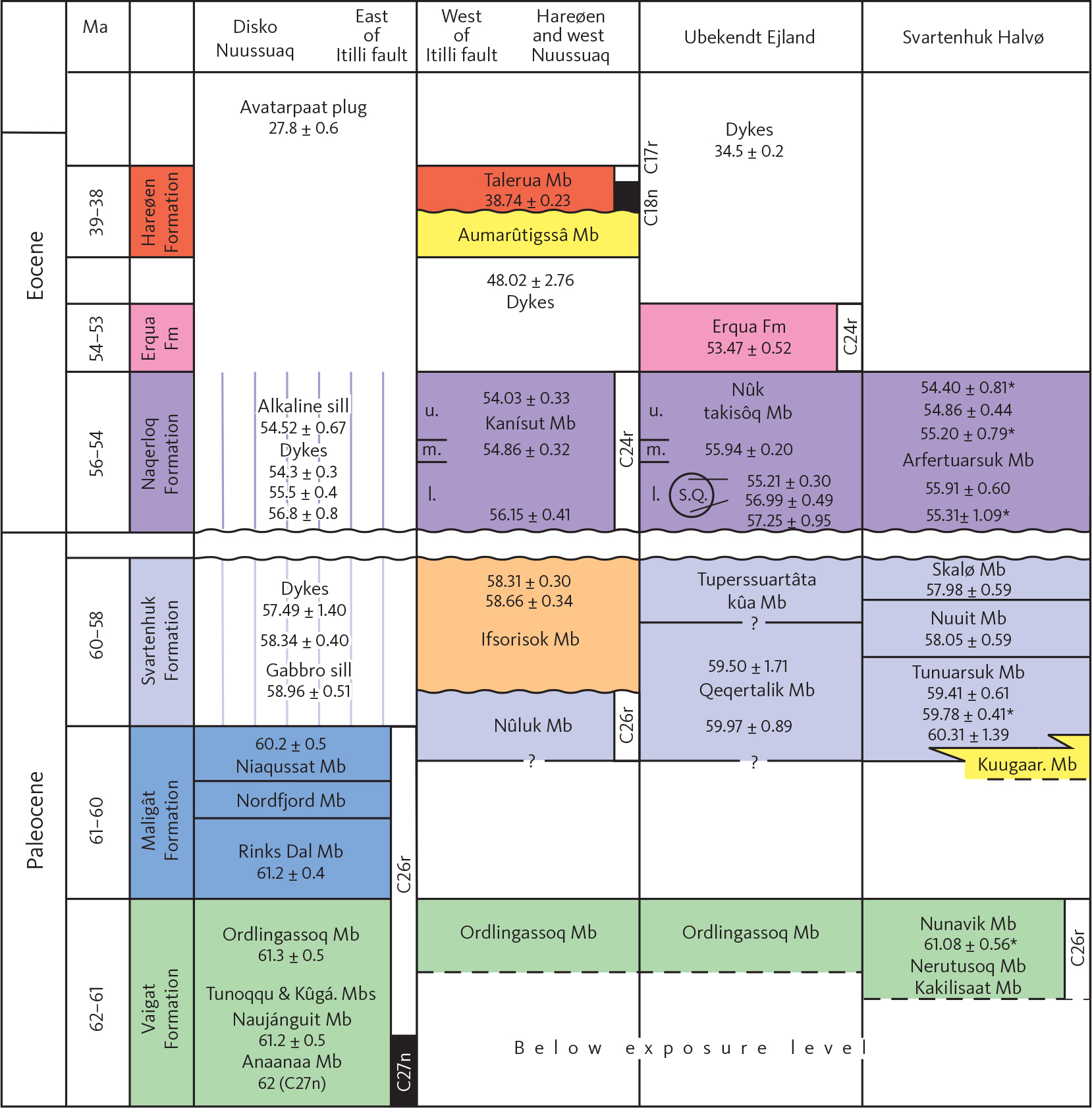 The upper age limit of the Vaigat Formation is not well constrained. It is estimated to be about 60–61 Ma based on the radiometric (40Ar/39Ar) ages for basalts low in the overlying Tunuarsuk Member of the Svartenhuk Formation (between 60.3 ± 1.4 Ma and 59.4 ± 0.6 Ma, Larsen et al. 2016) and an intervening hiatus indicated by a sediment horizon in the northern area.