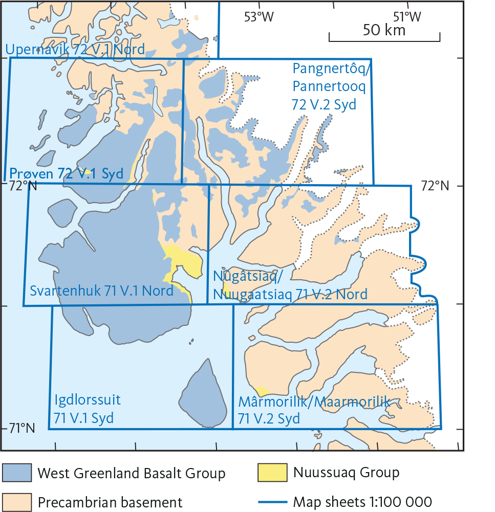 In this study, we formalise and describe the volcanic stratigraphy of the northern part of the Nuussuaq Basin on Svartenhuk Halvø, including the lavas that flowed across the Cretaceous Boundary fault system to the adjoining areas in the north, north-east and east. The major part of the work was done south of 72°N on Svartenhuk Halvø and the southern part of the Innerit peninsula in connection with mapping for the two 1:100 000 scale geological maps that cover these areas: 71 V.1 Syd Igdlorssuit and 71 V.1 Nord Svartenhuk (Fig. 4). Basalt flows occur as far north as 72°43′N and as far east as 51°54′W (Fig. 5), but north of 72°N and east of 53°40′W, the data coverage is of reconnaissance character only. The extent of the volcanic rocks shown on the published 1:100 000 geological maps 71 V.2 Nord Nûgâtsiaq/Nuugaatsiaq and 72 V.2 Syd Pangnertôq/Pannertooq (Fig. 4) is mainly based on photo interpretation (Henderson & Pulvertaft 1987; Guarnieri et al. 2022a, b). The area north of 72°N and west of 54°W is at present only covered by the 1:500 000 geological map sheet 4 Upernavik Isfjord (Escher 1985).