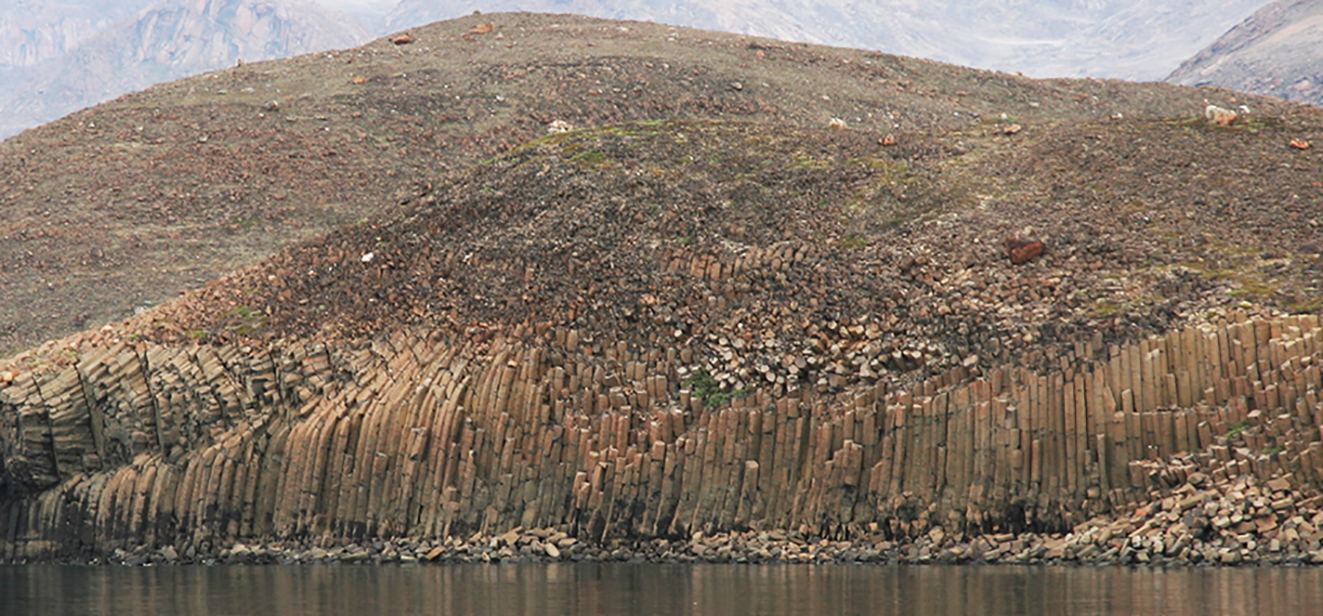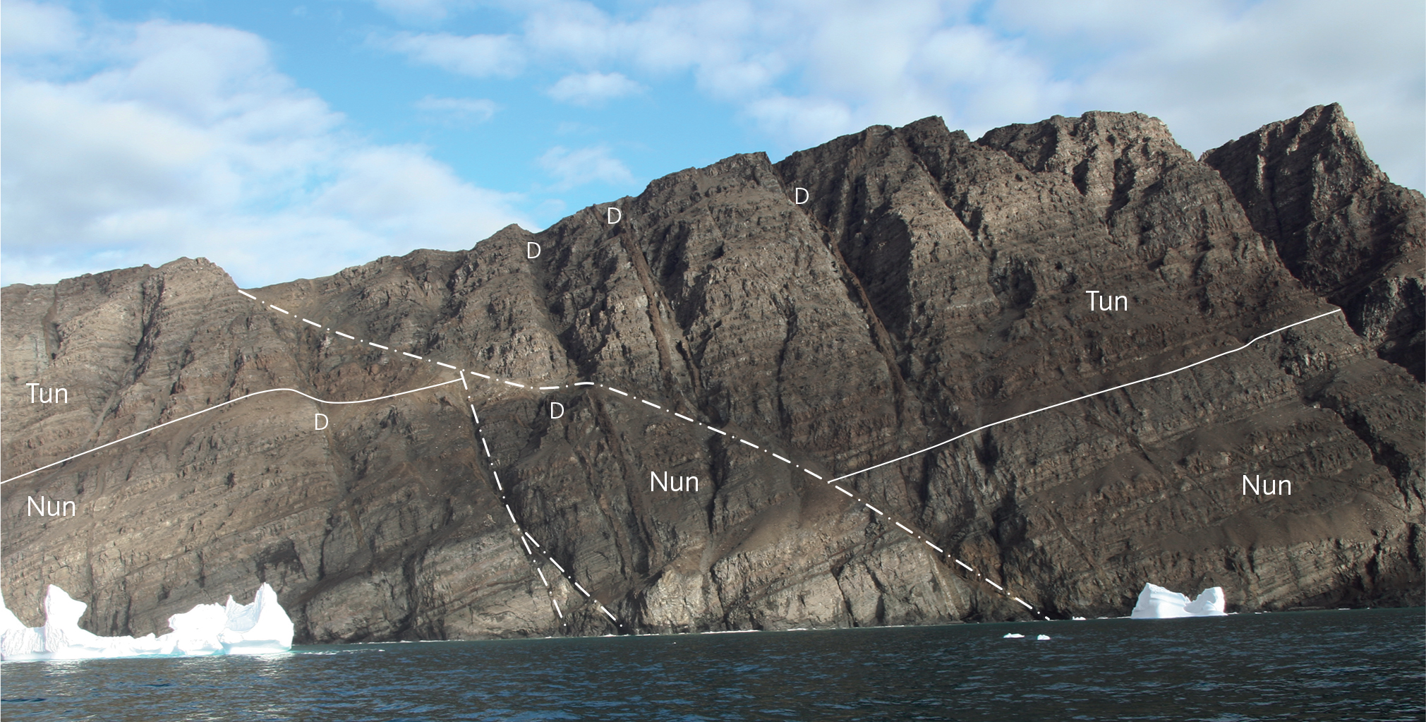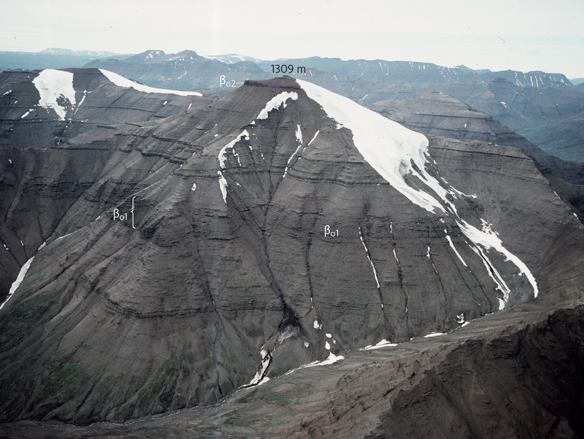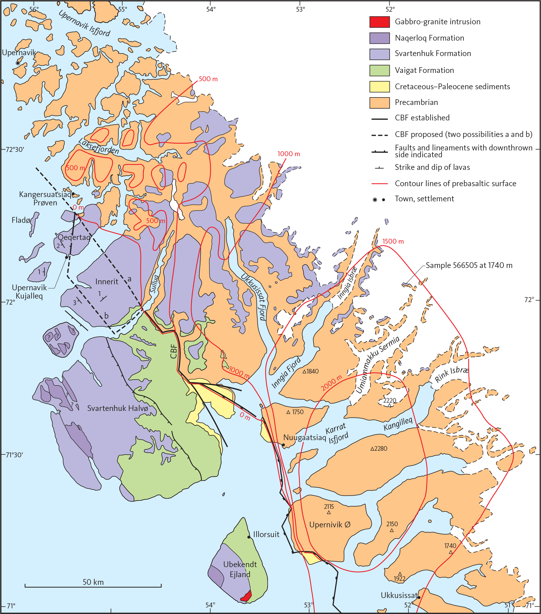The volcanic succession north of 72°N is nearly flat-lying and with few exceptions unfaulted. In the western part of the area, the base of the lava pile is below sea level, and to the east, the lavas rest on the Precambrian basement that rises from sea level to an altitude of 2000 m close to the Greenland ice sheet. The overall dip of the lava succession here is around 1°NW to W, similar to the dip of the pre-basaltic basement surface.