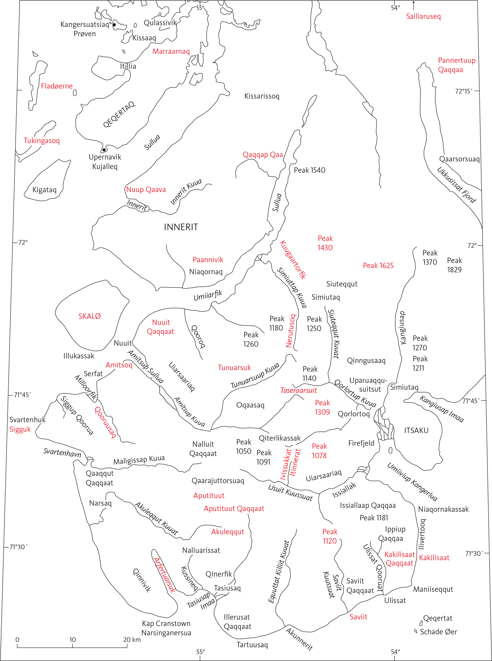 The digital elevation model in Fig. 9 gives an impression of the topography of the area; of particular notice are the mountainous areas separated by wide valleys with little or no exposure. A low-lying area seen in central western Svartenhuk Halvø presents a combination of poor exposures, faulting and steep and variable dips of the fault blocks; in this area some geological boundaries are only tentative or not placed at all, e.g. the boundary between the Nuuit and Skalø Members.