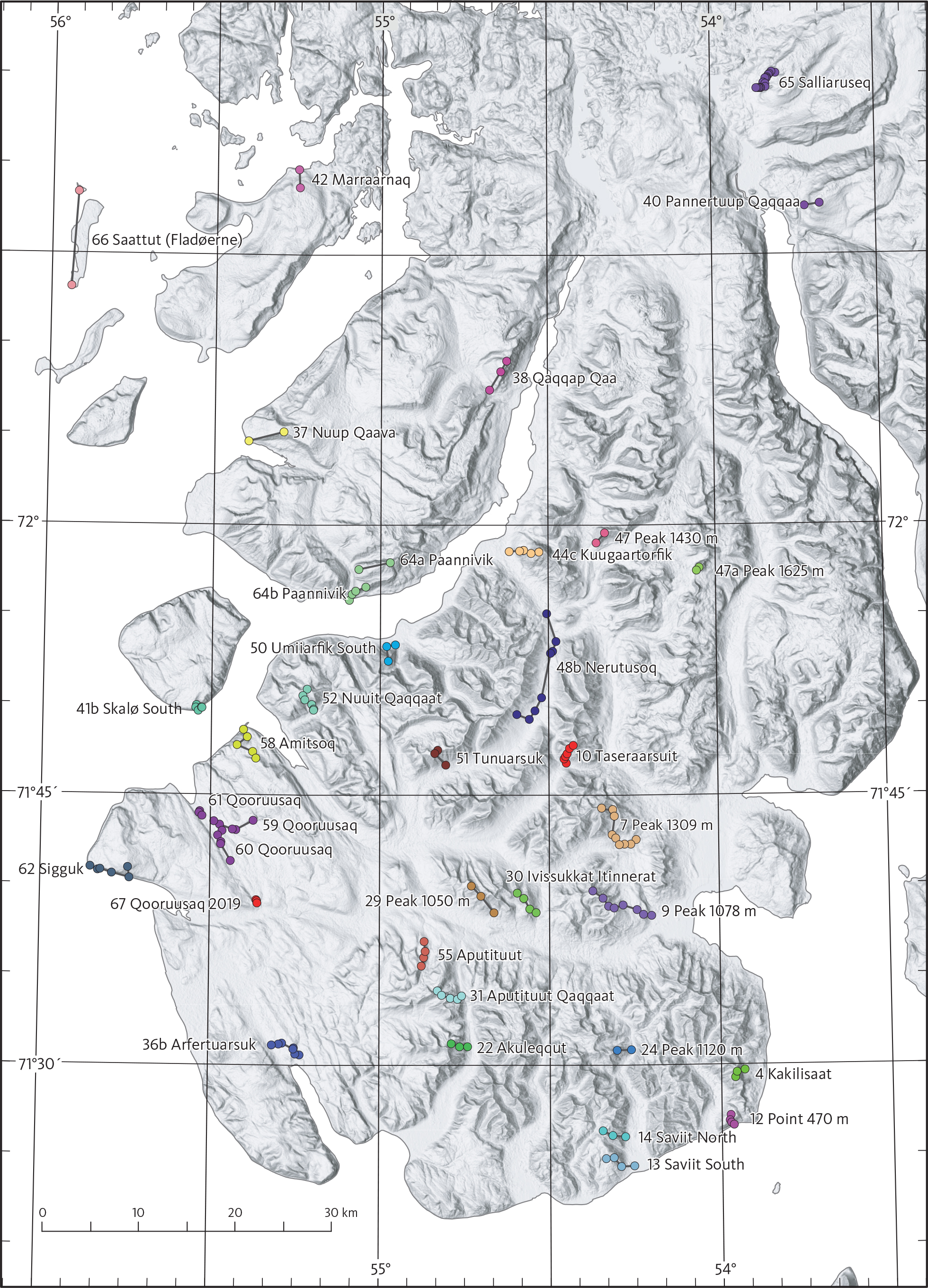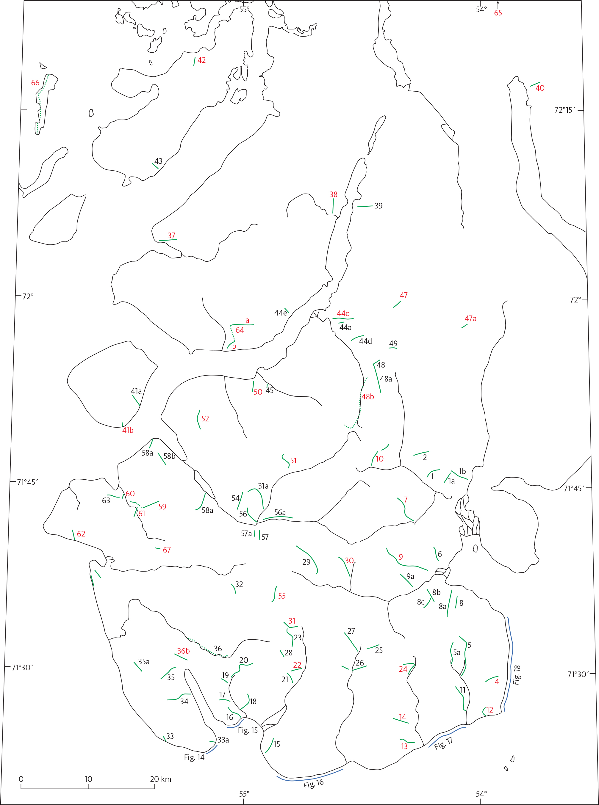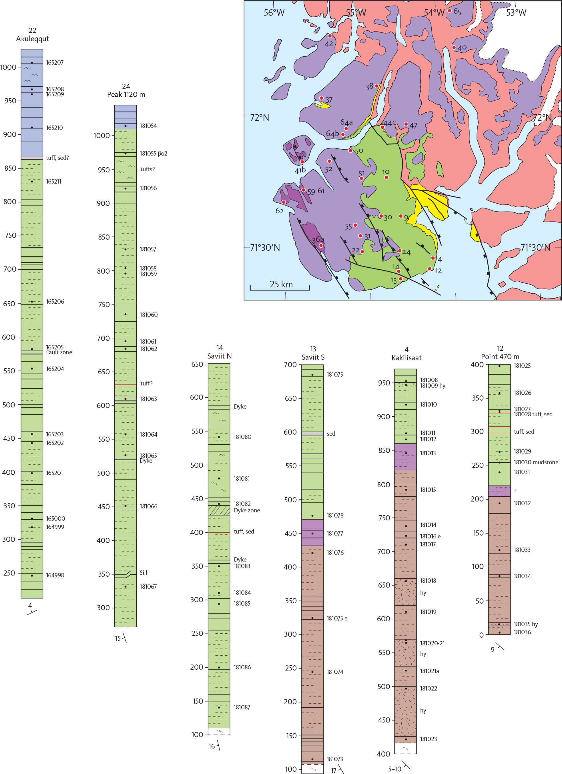 This study is based on geological mapping by J.G. Larsen in 1974, 1976, 1980 and 1983, in 1983 together with T.F.D. Nielsen, and on geological mapping by K.A. Jørgensen in 1981. It is also based on earlier works, particularly by T.C.R. Pulvertaft, as described in Larsen & Pulvertaft (2000). Supplementary sampling was done by various field parties of the Geological Survey of Denmark and Greenland (GEUS) in the period 2009–2019. During mapping, the logging and sampling were preferentially done in traverses at locations where the stratigraphy was relatively undisturbed by faulting, although some profiles have been pieced together from shorter sections. Flow-by-flow sampling was applied when possible. Mapping and location of profiles and samples were done on aerial photographs on a scale of c. 1:40 000, and altitudes were measured with a traditional altimeter. Samples from 2009 and later were located and their altitudes measured with GPS (Global Positioning System). In total, 67 numbered and named profiles were measured and described in the field but not all of these were also sampled. The place names mentioned here are shown in Fig. 7 and the locations of all profiles are shown in Fig. 8.