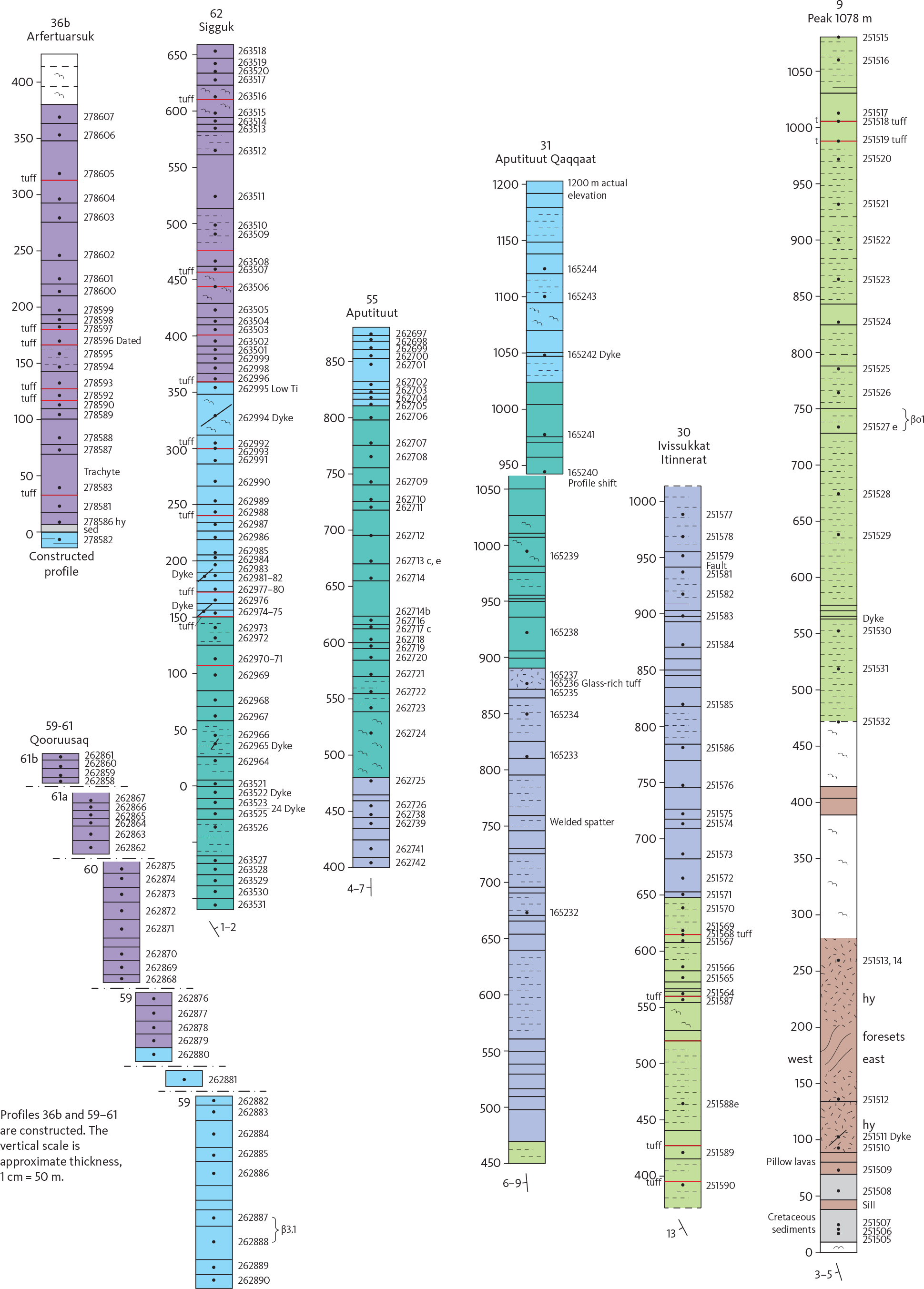 According to our interpretation, the analysed sample profiles through the Eocene basalts from the northern and the southern areas, mainly the Sigguk, Qooruusaq and Arfertuarsuk profiles (62, 61, 36b), are nearly laterally equivalent (Figs 11, 42). They are geochemically similar but do not show any obvious mutual correlation.