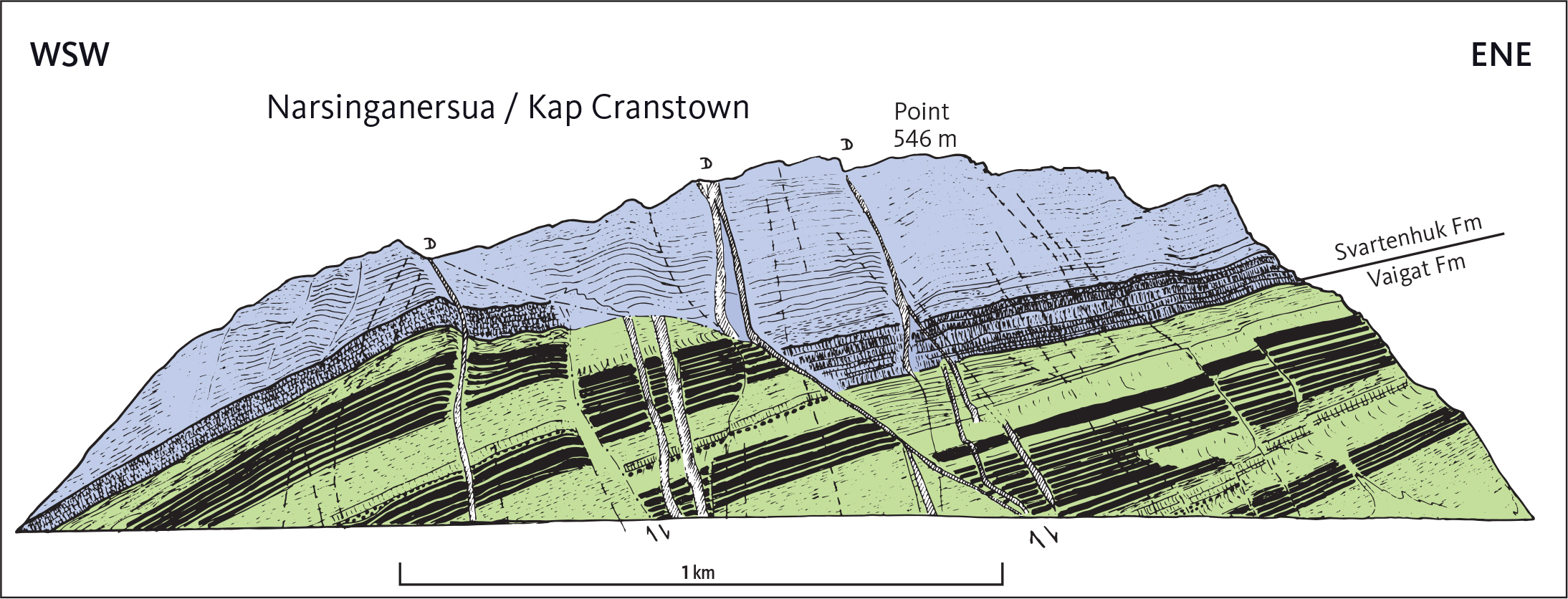 Syn- and particularly postvolcanic faulting is evident almost everywhere in the basin on Svartenhuk Halvø. Numerous postvolcanic extensional faults trending NW–SE have divided the area into a number of rotated fault blocks with SW-dipping strata with different dips (Fig. 6; Larsen & Pulvertaft 2000, figs 2, 9 and p. 23). Dips are smallest in the north-eastern and northern areas (2°–10°) and increase to 10°–45° south of some WNW–ESE-trending transfer faults. The largest fault is the NW–SE-trending Arfertuarsuk fault that runs through the Arfertuarsuk inlet in the south to Svartenhavn in the north (Fig. 6; names on Fig. 7) with a downthrow of the north-eastern block of at least 2 km at its south-eastern end (Larsen & Pulvertaft 2000, p. 24). Therefore, the youngest part of the succession is found on the north-eastern side of the Arfertuarsuk fault (Fig. 6) where the basalts dip 15–23°SW or more, and north thereof where the basalts dip only 0–10°. South-west of the Arfertuarsuk fault the Vaigat Formation reappears at Narsinganersua (Kap Cranstown) together with the older parts of the Svartenhuk Formation.
