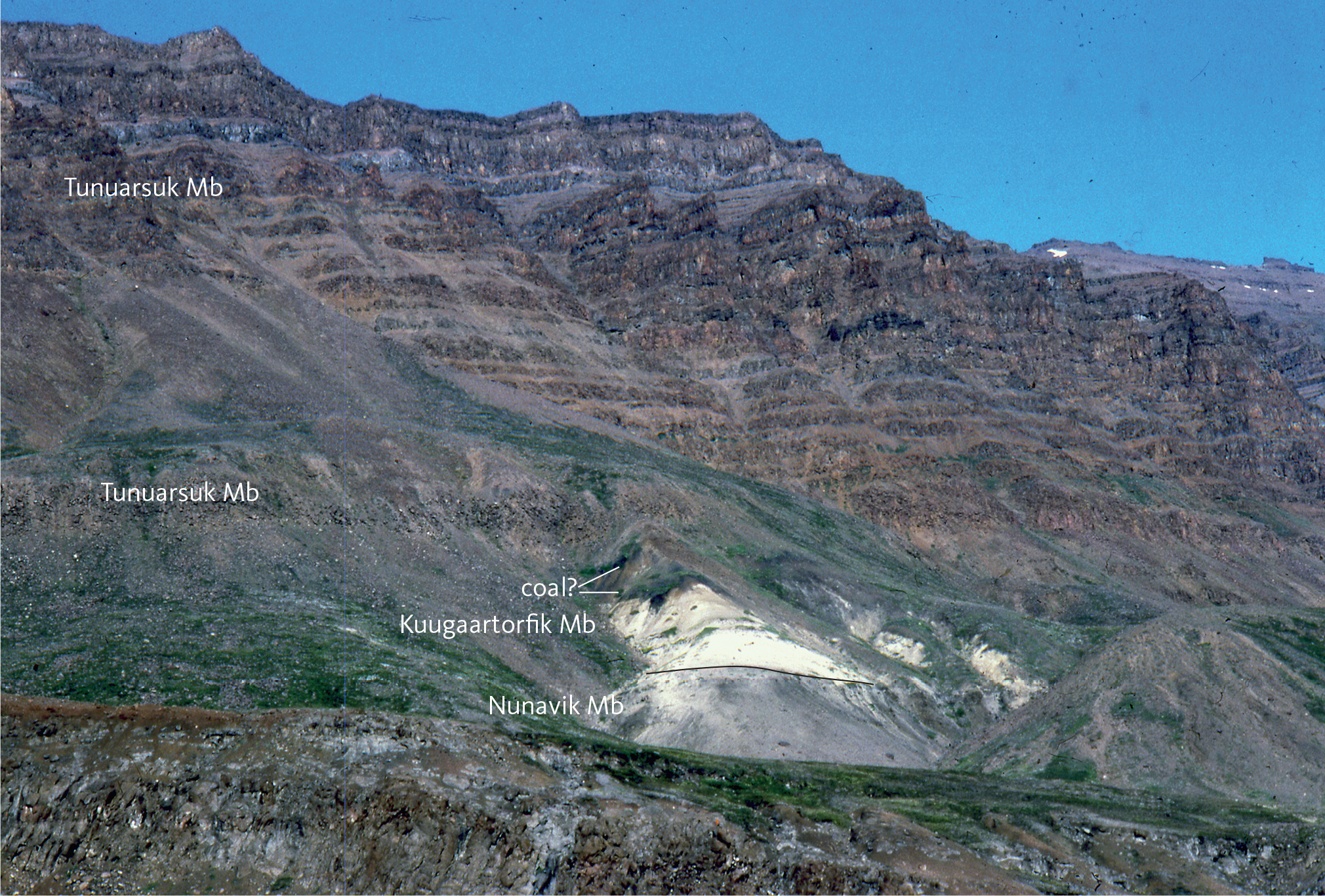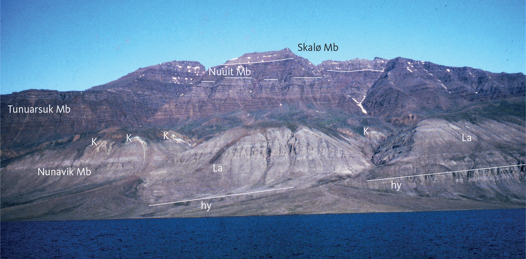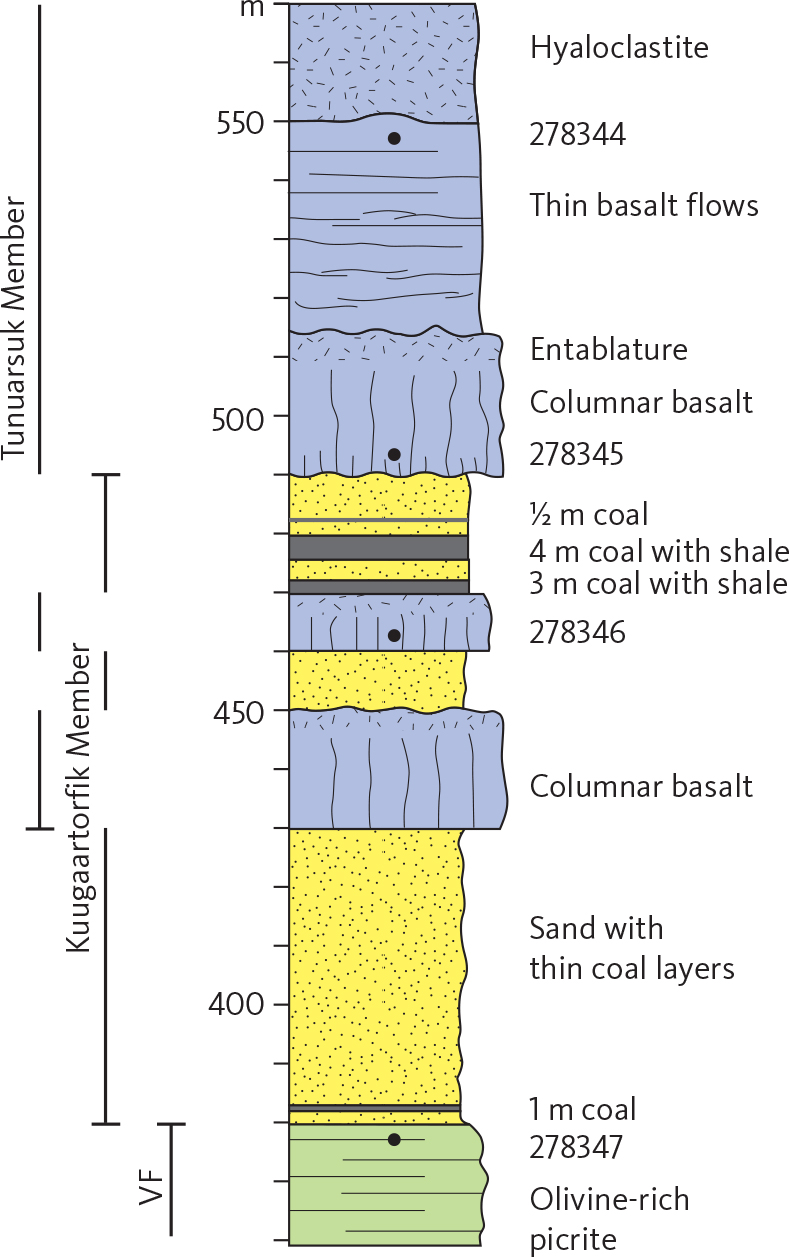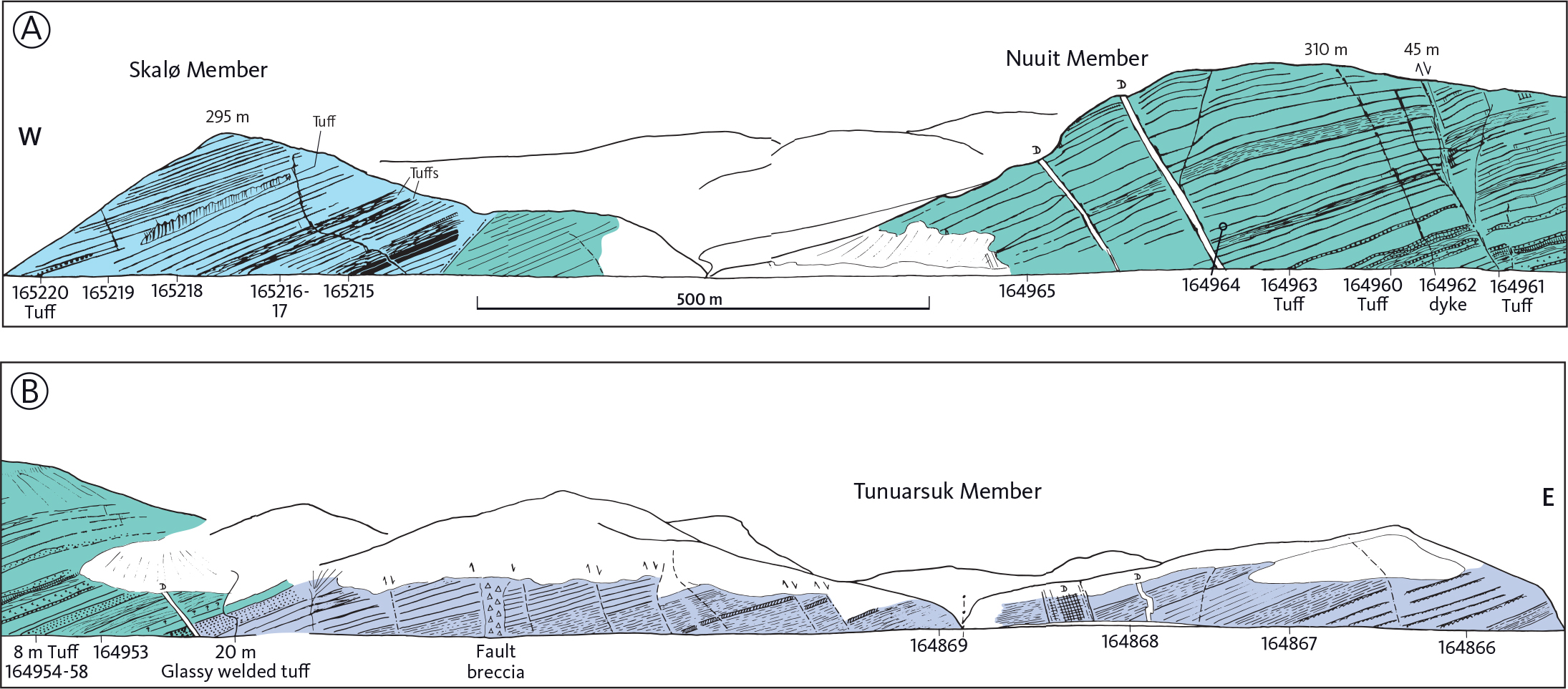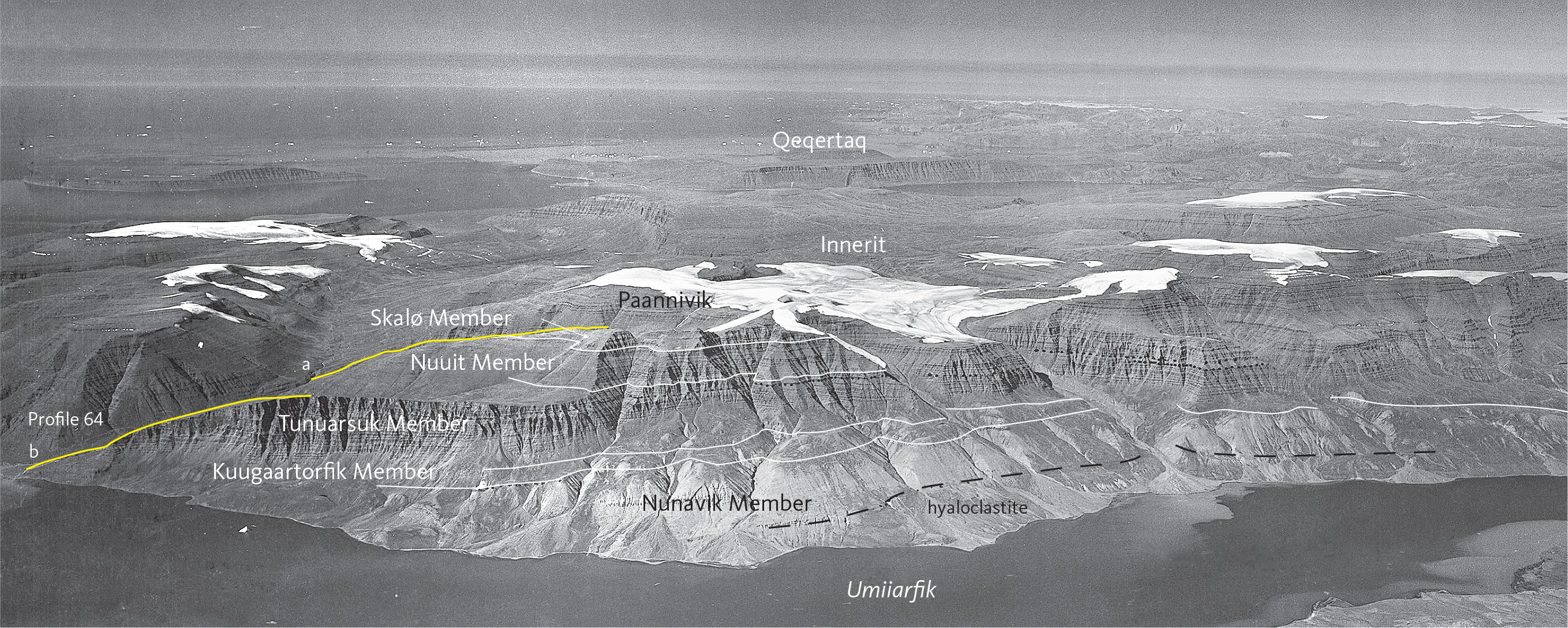 The Svartenhuk Formation comprises four members. The lowest, Kuugaartorfik Member, is up to 100 m thick and consists partly of quartzofeldspathic and partly volcanogenic sediments; it is restricted to northern Svartenhuk Halvø and the Innerit peninsula. The overlying volcanic Tunuarsuk, Nuuit and Skalø Members are voluminous and widespread, with a combined thickness of up to 1800 m. They consist of tholeiitic basalts with similar chemical compositions but with correlatable stratigraphic variation patterns. The Tunuarsuk Member consists of interspersed flow groups of thin, grey flows and massive, brown flows; the Nuuit Member comprises mainly massive brown flows, and the Skalø Member is dominated by light grey flows. The Svartenhuk Formation oversteps the Vaigat Formation on the basement in the north and east. In these distal areas the Tunuarsuk and Nuuit Members constitute the major volumes, and preserved thicknesses are up to 1400 m. In northern and eastern Svartenhuk Halvø and also farther to the north and east, foreset-bedded hyaloclastites indicate transport directions towards the north and possibly east from eruption sites within the basin.