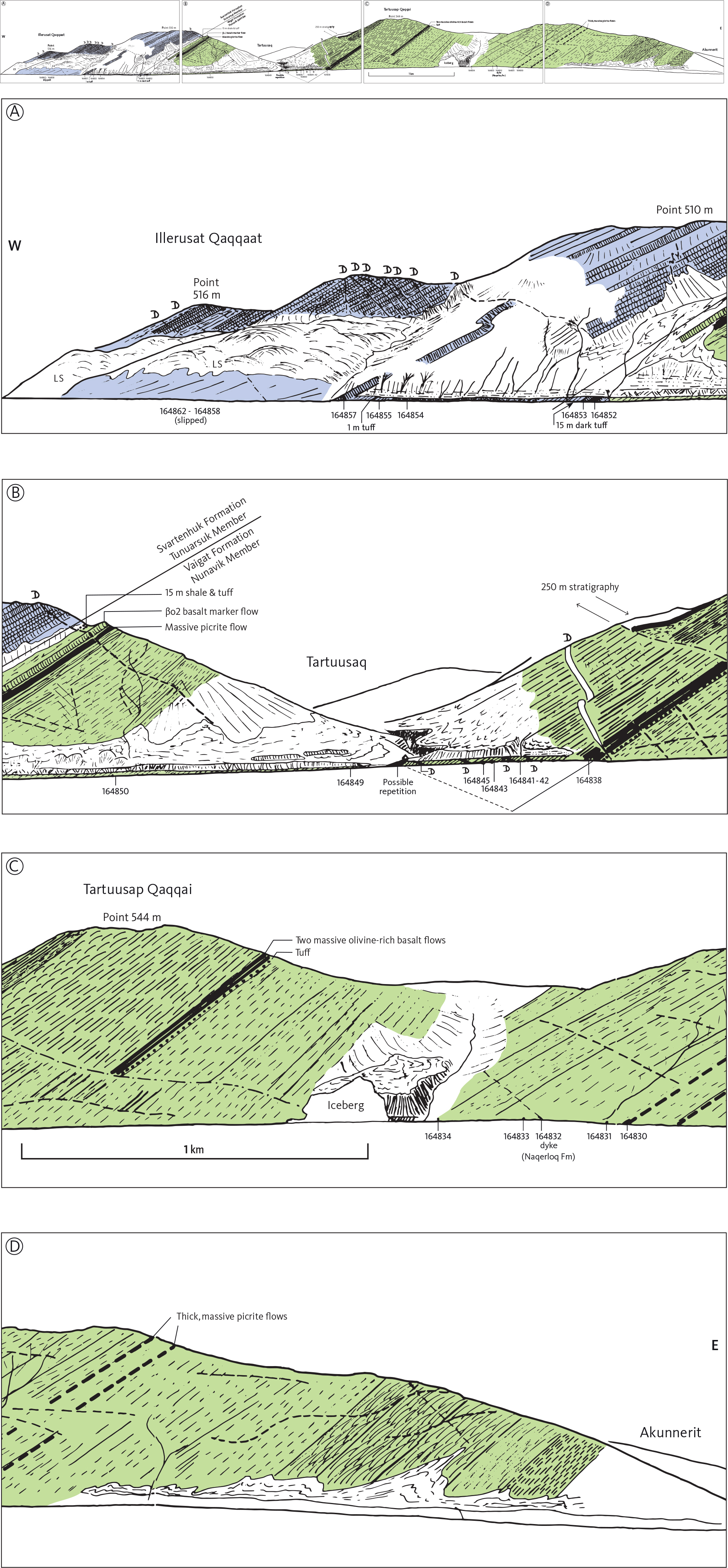 In the area north of the Arfertuarsuk inlet where the trachyte and the overlying lava flows have been mapped (Larsen & Grocott 1991), the trachyte flow is underlain by two or three lava flows with hyaloclastite and hyalotuffs resting on c. 20 m of reworked volcaniclastic sediment. This sediment has been referred to the uppermost Skalø Member of the Svartenhuk Formation. The flows below the trachyte and above the sediments have the chemical character of the Naqerloq Formation but have significantly lower TiO2 (1.8–2.06 wt%) than the flows above the trachyte (>2.4 wt% TiO2; see Fig. 42 and the Geochemistry chapter). Flows with similar low-Ti compositions occur at the base of the Naqerloq Formation at Sigguk (profile 62) and in the northern Qooruusaq valley (profile 59–61). We therefore consider it most probable that the trachyte flow did not reach the northern areas, and that the top of the low-Ti flows marks the level corresponding to the trachyte. This means that the three profiles, Sigguk (62), Arfertuarsuk (36b) and Qooruusaq (59–61), are laterally equivalent. Indeed, their basalts are compositionally very similar although no single flows are correlatable and the TiO2 developments up-section are different (Fig. 42).