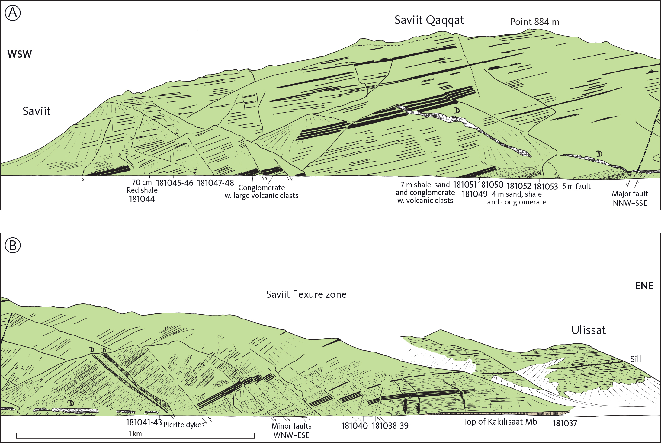 The south-western part of the area considered here, i.e. the northern Nuussuaq Basin area, comprises much of Svartenhuk Halvø and is dominated by volcanic rocks, which rest on Cretaceous–Paleocene sediments of the Nuussuaq Basin (Figs 2, 6). The prevolcanic sediments are exposed in the eastern part of Svartenhuk Halvø and have been described in overview by Larsen & Pulvertaft (2000). Dam et al. (2009) referred them to the Albian–Cenomanian Upernivik Næs Formation (deltaic sandstones interbedded with mudstones), the Turonian–Campanian Itilli Formation (marine mudstones), and the Maastrichtian–Danian Kangilia Formation (mudstones with conglomerates). Dam & Sønderholm (2021) reviewed the tectonostratigraphic evolution of the Nuussuaq Basin during the Cretaceous and Palaeogene with five phases of repeated rifting and faulting with concomitant sedimentation and finally breakup and volcanism.