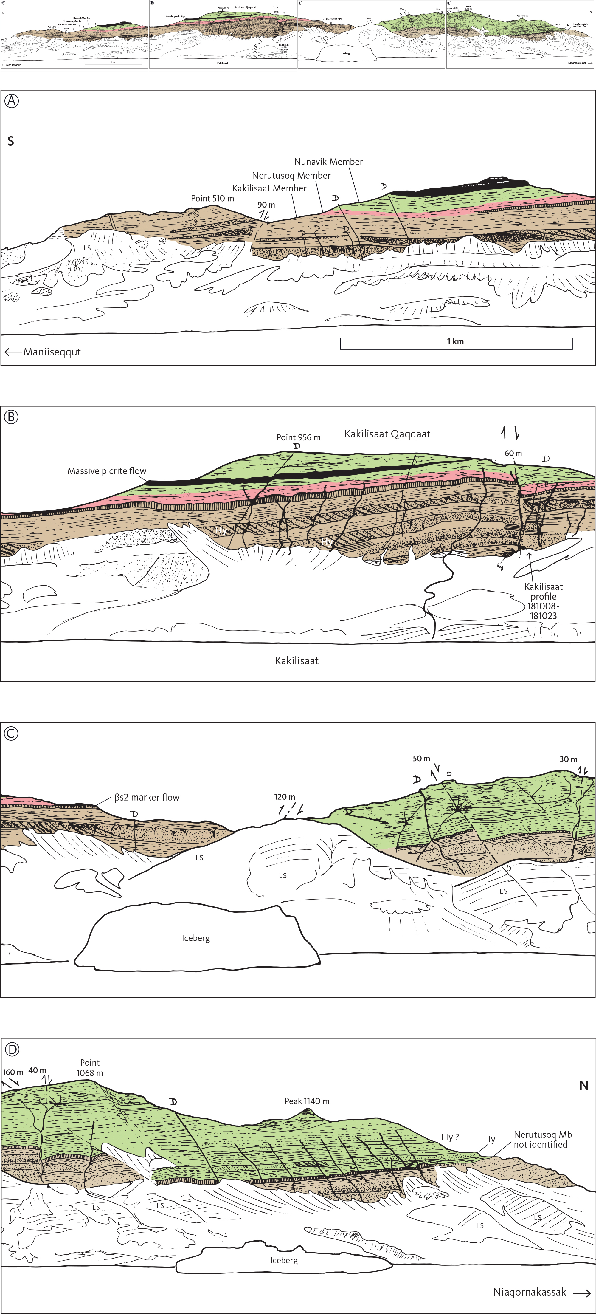 Kakilisaat Member: brown to grey, silica-enriched, crustally contaminated basalts, basaltic andesites and a few picrites.