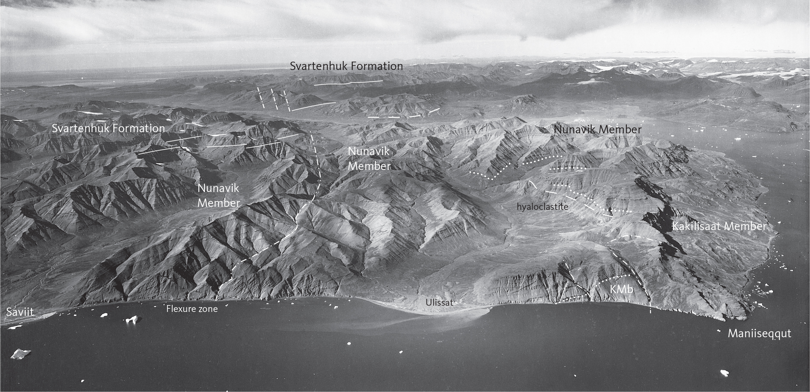 Volcanism on Svartenhuk Halvø may have started somewhat later than in the southern Nuussuaq Basin. The Nunavik Member correlates excellently with the upper part of the Vaigat Formation (Ordlingassoq Member) in the south, but older members of the Vaigat Formation exposed on Disko and Nuussuaq may be present at depth beneath the western Svartenhuk Halvø. At the end of the volcanic activity of the Vaigat Formation, the Mg-rich volcanic rocks formed a N–S elongated, mainly subaerially exposed dome that extended for c. 250 km from central Disko and Nuussuaq over Ubekendt Ejland, where thicknesses appear to be greatest, and across Svartenhuk Halvø to the southern Innerit peninsula, where the formation thins and tapers out.