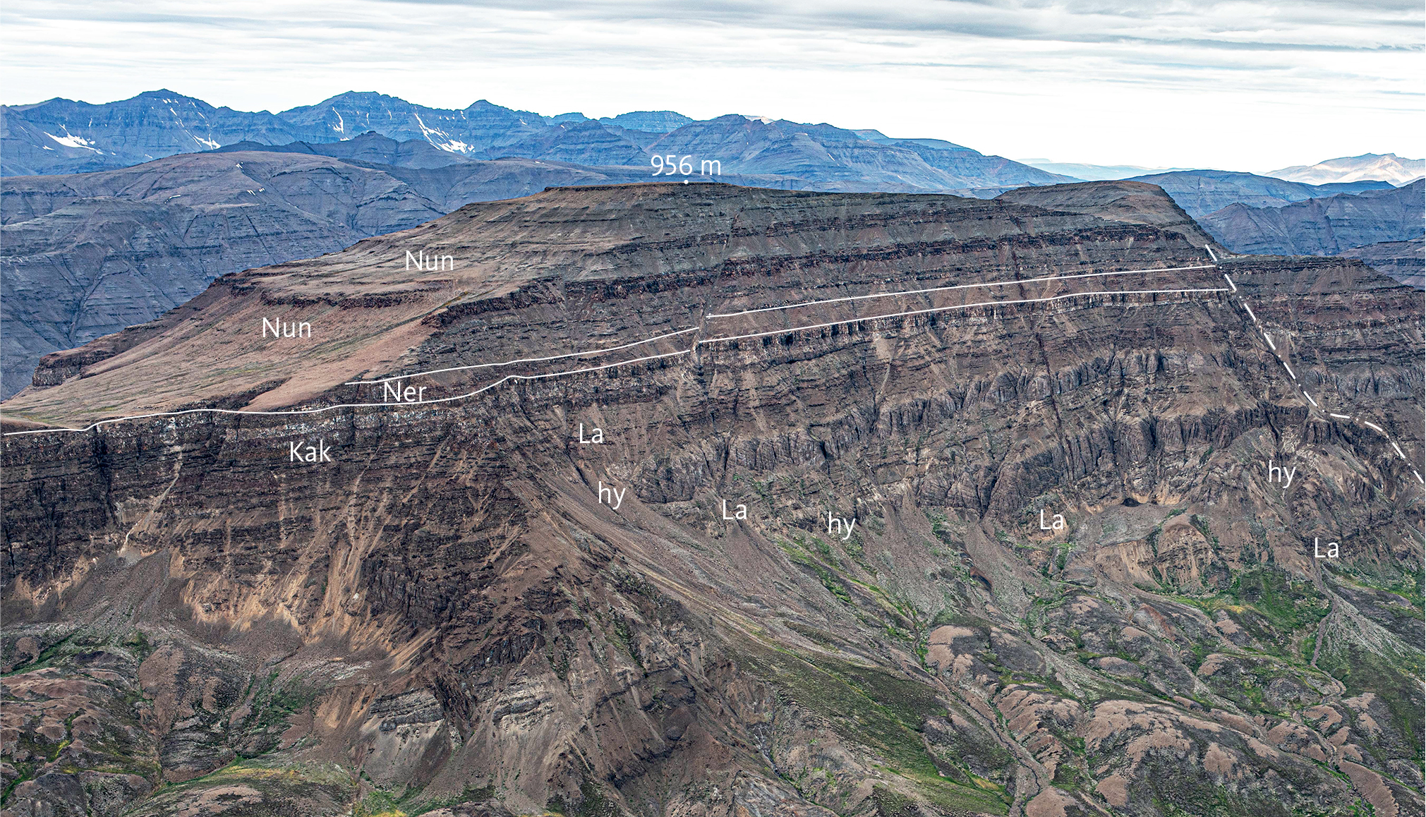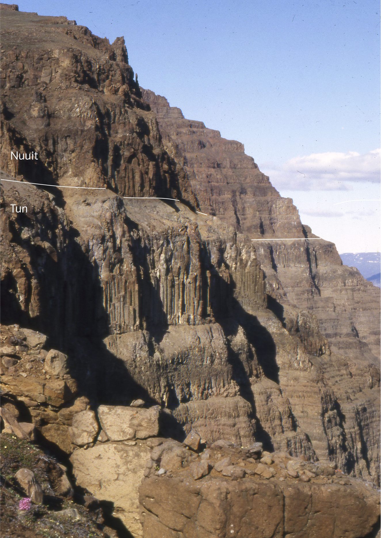 Lithology. The Naqerloq Formation is dominated by massive, brown, subaerial basalt lava flows of sheet flow type. The basalts are plagioclase-olivine-clinopyroxene-phyric, microphyric or aphyric. Intermediate and acid tuffs are present at some levels (Hald 1976; Larsen 1977; Larsen et al. 2016), which has significantly contributed to the accuracy of the radiometric age determinations.
