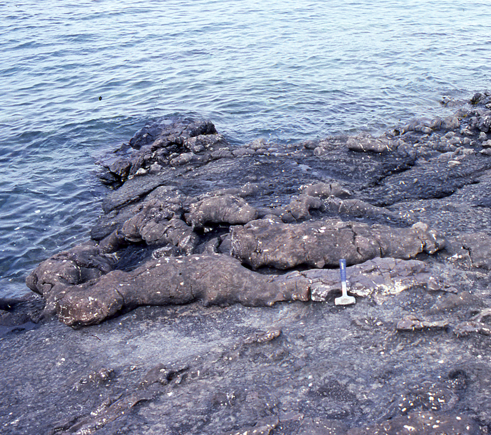 Subaqueous lava flows are thick flows that commonly display various kinds of columnar jointing; they are usually brecciated in their upper part and capped by yellowish brown hyaloclastite; their top zones do not show red oxidation. Other fully or partly subaqueous flows are pillow lavas with pillows with glassy rims.