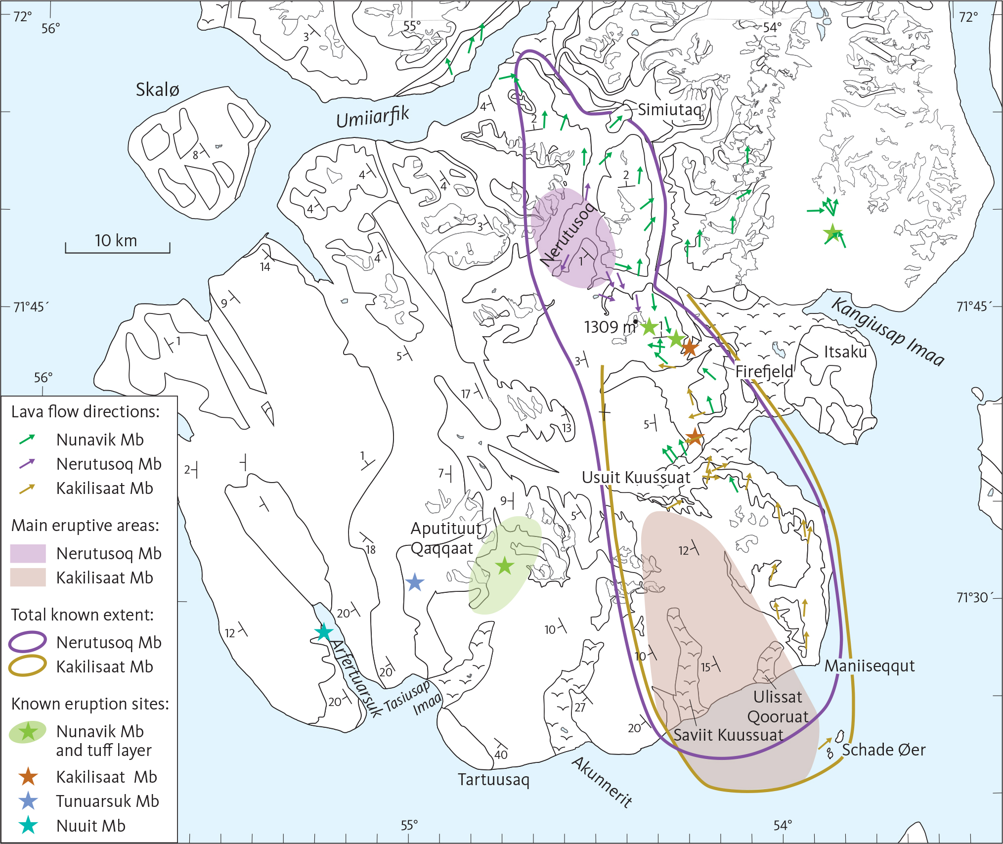 At the transition from Paleocene to Eocene time, there was a volcanic hiatus that lasted for c. 1–2 Ma during which tectonic movements and reorganisation of plate spreading directions took place. Volcanism resumed with extrusion of the Naqerloq Formation basalts, which are compositionally different from the Paleocene basalts and were generated in a different mantle. Lava successions of the Naqerloq Formation are preserved only in the westernmost parts of the Nuussuaq Basin from Hareøen to Svartenhuk Halvø and mainly as erosional remnants, but dykes throughout Disko, Nuussuaq and Svartenhuk Halvø show that the formation was erupted over large parts of the Nuussuaq Basin. It is probably also extensively present offshore where it has been recognised in the drill hole Delta-1.