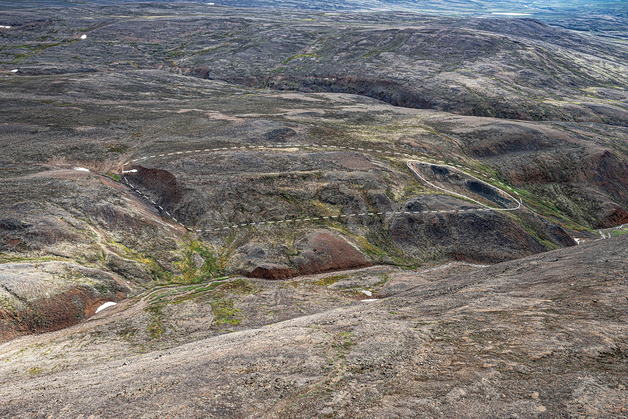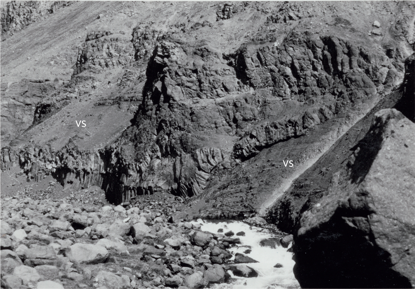 The northern outlier of the trachyte in the Qooruusaq valley was briefly visited in 2019 by K. Svennevig (Fig. 63). Below the trachyte, there is an unexposed horizon 10–15 m in thickness, which may represent a sediment horizon although no sediment was seen. Two basalt flows below this horizon and a single basalt flow overlying the trachyte were sampled (profile 67 in Fig. 9). The geochemical analyses showed that whereas the flow above the trachyte has the enriched character of the Naqerloq Formation, the two flows below the trachyte have not; they have the typical character of the Paleocene basalts and are considered to belong to the Skalø Member of the Svartenhuk Formation. The trachyte flow is therefore the oldest Eocene lava flow at this locality. The apparent stratigraphic continuity to the Eocene flow succession in profile 59–61 farther north in the Qooruusaq valley is therefore lost. We must assume that an unexposed fault crosses the valley between the trachyte outlier and the Qooruusaq sample profile (Fig. 11), with a relative downthrow of c. 300 m of the succession to the north (Fig. 6).