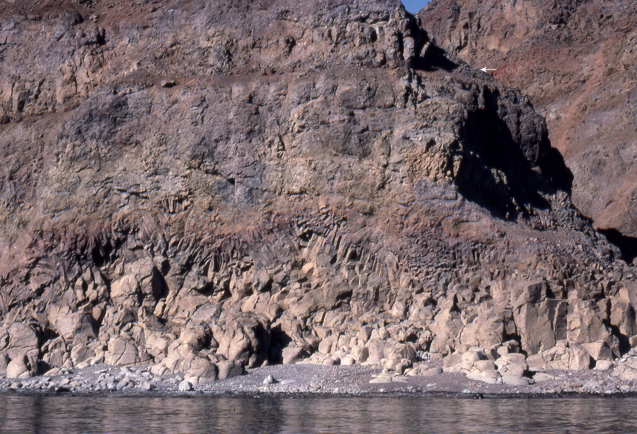 Loc. D. One of the rare post-basaltic faults in the northern area crosses Qeqertaq with a direction close to N–S and a 25 m downthrow to the west. This fault appears to form the boundary between 1°NW-dipping basalts to the east and 1–2°SW-dipping basalts to the west and may reflect the position of the buried Cretaceous boundary fault system, which must run out to sea immediately north-west of Qeqertaq (Fig. 5, line b). The lavas on Tukingasoq island also dip 1–2°SW whereas the lavas on Kigataq island dip c. 2°W.