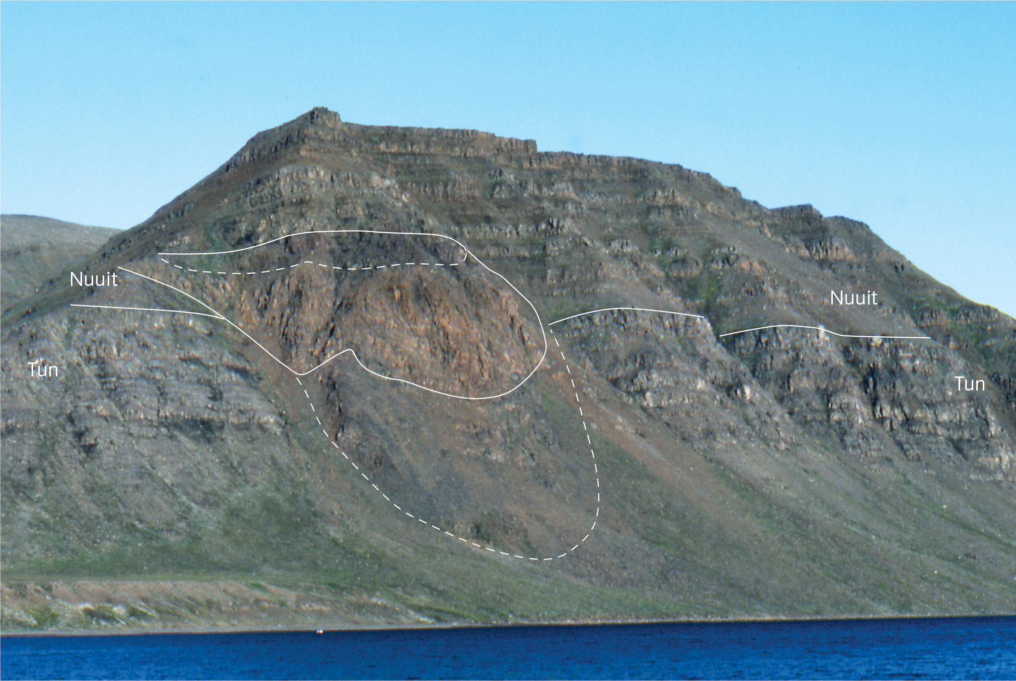The highest altitude of the upper boundary is close to 1300 m and is found at Peak 1309 m within the basin in central eastern Svartenhuk Halvø. The same altitude of the upper boundary is found on the basement near Qinngusaaq 12 km north-east of Peak 1309 m (Larsen & Grocott 1991). This shows that the inversion of the basinal area noted by Münther (1973) and Larsen & Pulvertaft (2000, p. 22) is differential with the largest altitude differences in the north, decreasing towards the south-east.