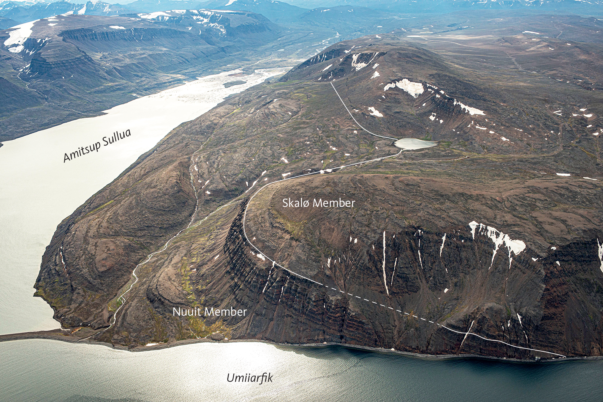 The Naqerloq Formation comprises one member, the Arfertuarsuk Member, consisting of flows of brown basalt with relatively enriched chemistry and a single trachyte flow. The member is only found in western Svartenhuk Halvø and on Skalø, where it conformably overlies the older lavas with up to 350 m thickness preserved after erosion.