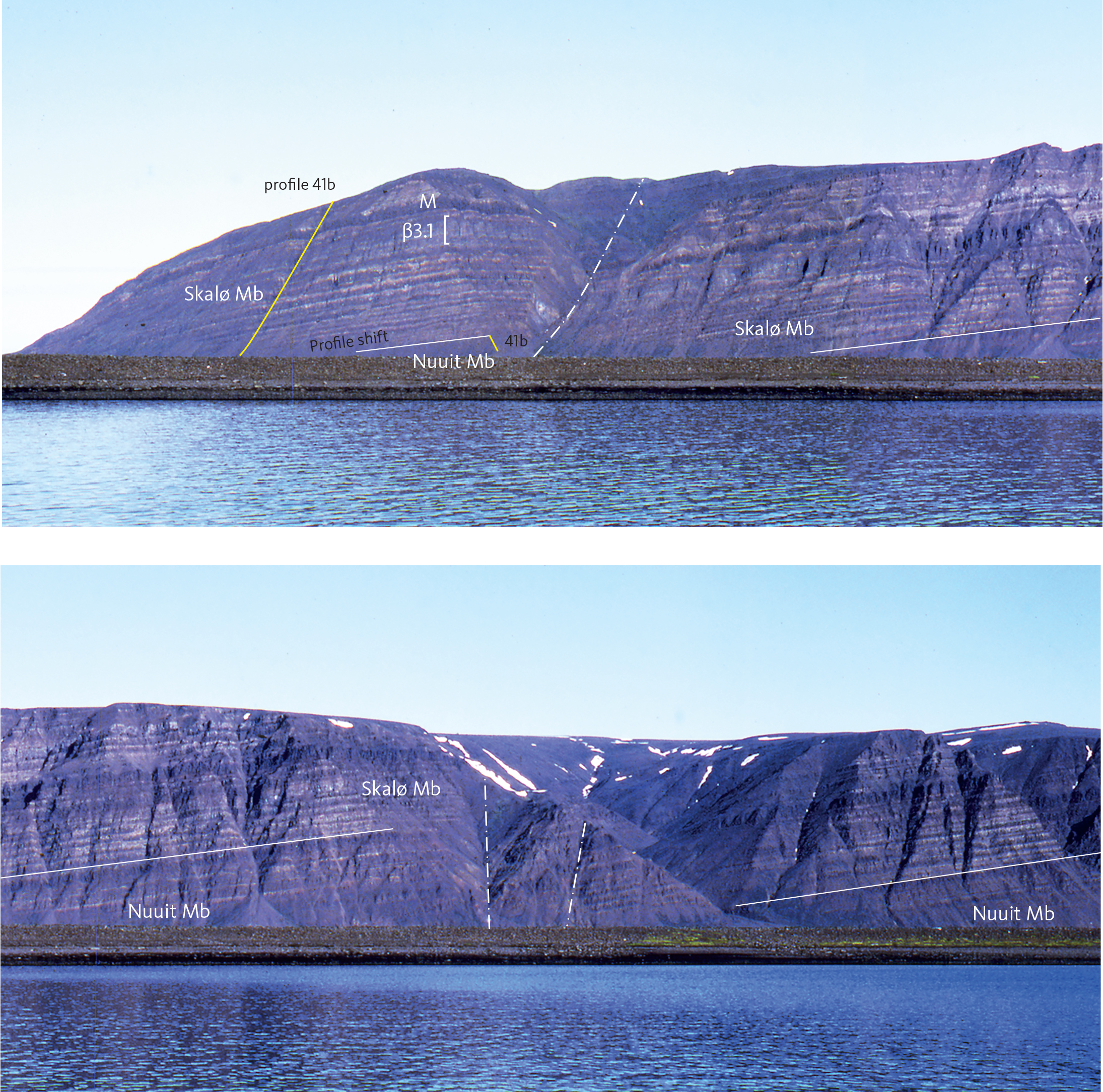 Loc. A. A prebasaltic, N–S-trending fault is presumably situated in Sullua fjord east of the Innerit peninsula. This is suggested from a jump in surface altitude of the basement across the fjord from 500 m a.s.l. on the eastern side to close to sea level on the western side of the fjord. The lava successions in the profiles 38 and 39 on the opposite fjord sides (Fig. 8) roughly correlate across the fjord with the elevation differences caused by the regional dip of 1°W of the lava pile.