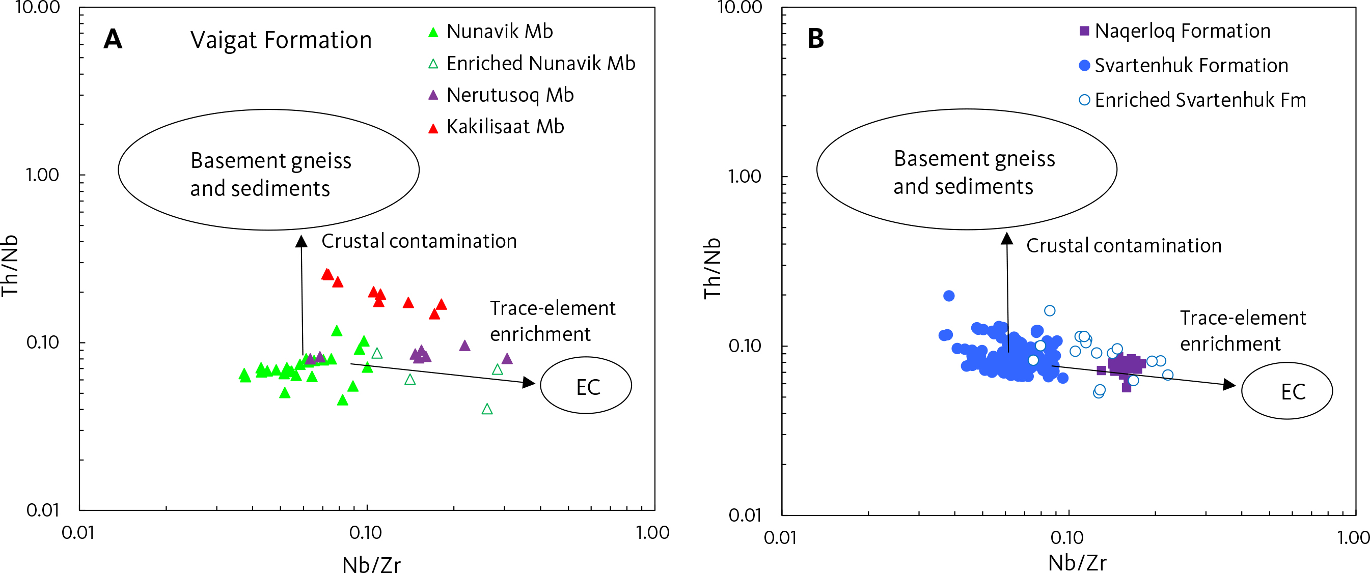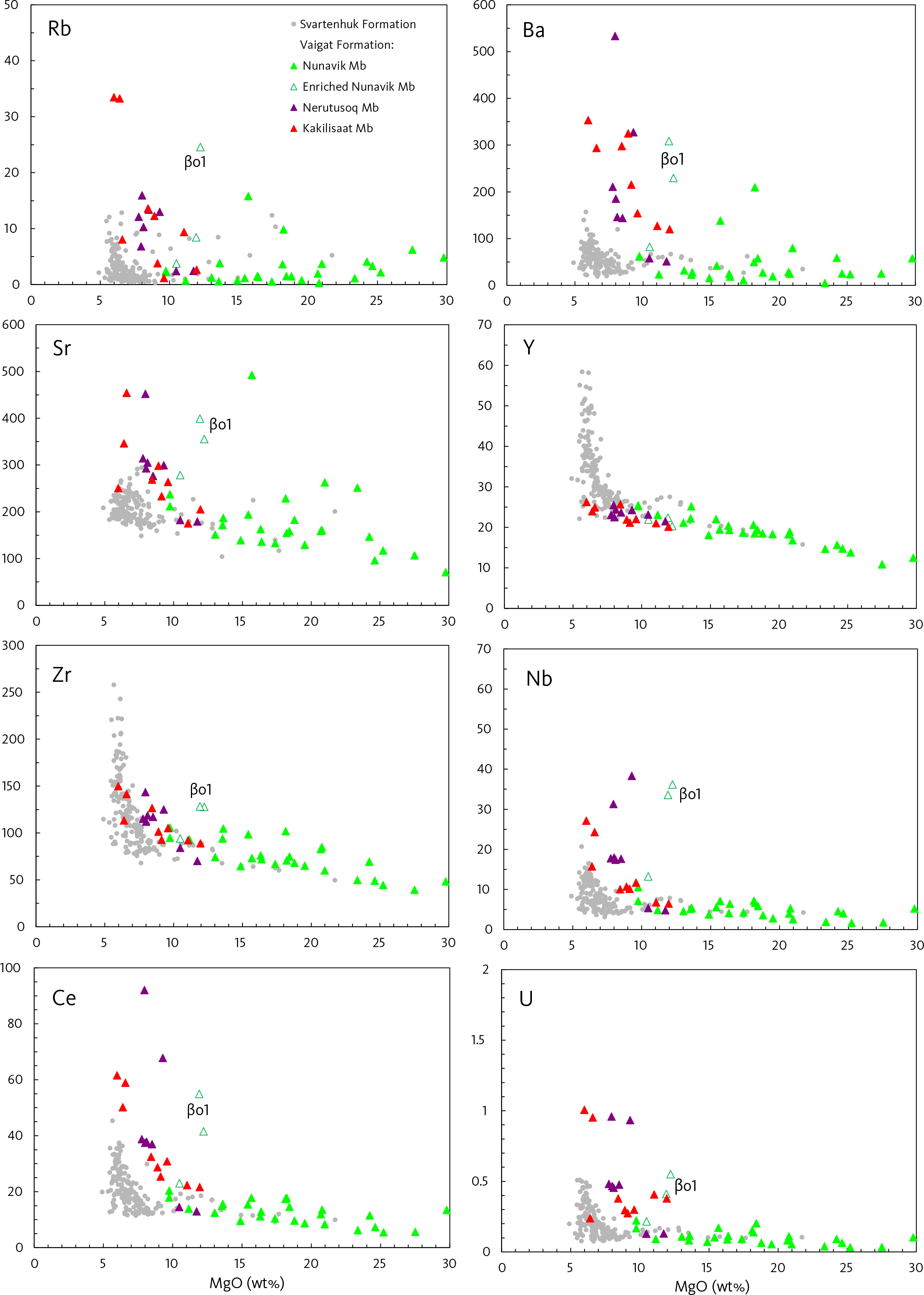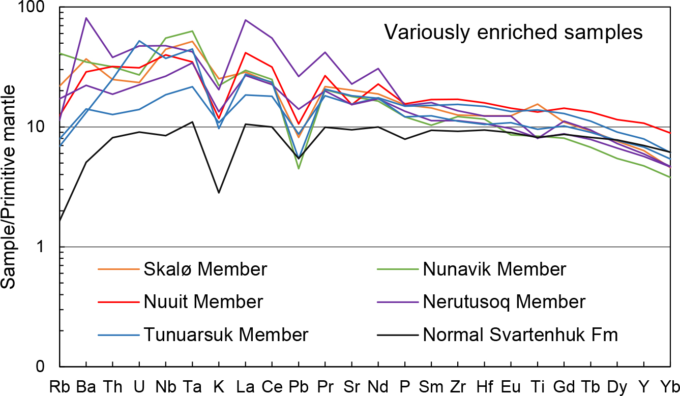 In the Nunavik, Tunuarsuk and Skalø Members chemically enriched lavas occur as individual flows surrounded by flows that are chemically normal. We consider it most probable that the magmas of these flows have acquired their enrichment on their way to the surface after they left the melting column (Nunavik Member, the βo1 marker unit) and the deep-seated magma chambers (Tunuarsuk and Skalø Members). The enriched components therefore resided in the lithospheric mantle or crust and represent veins or dykes of older alkaline rocks, which could easily be partially melted and assimilated by batches of passing hot basaltic and picritic melts on their way to the surface. The resulting enrichment patterns would depend on the melting mineral assemblage. Older alkaline carbonate-rich rocks are reported from the region, e.g. from the islands of Qinngusaaq and Qeqertarsuaq, both c. 30 km east of southern Svartenhuk Halvø (Henderson & Pulvertaft 1987; Knudsen et al. 2010; Mott et al. 2013).