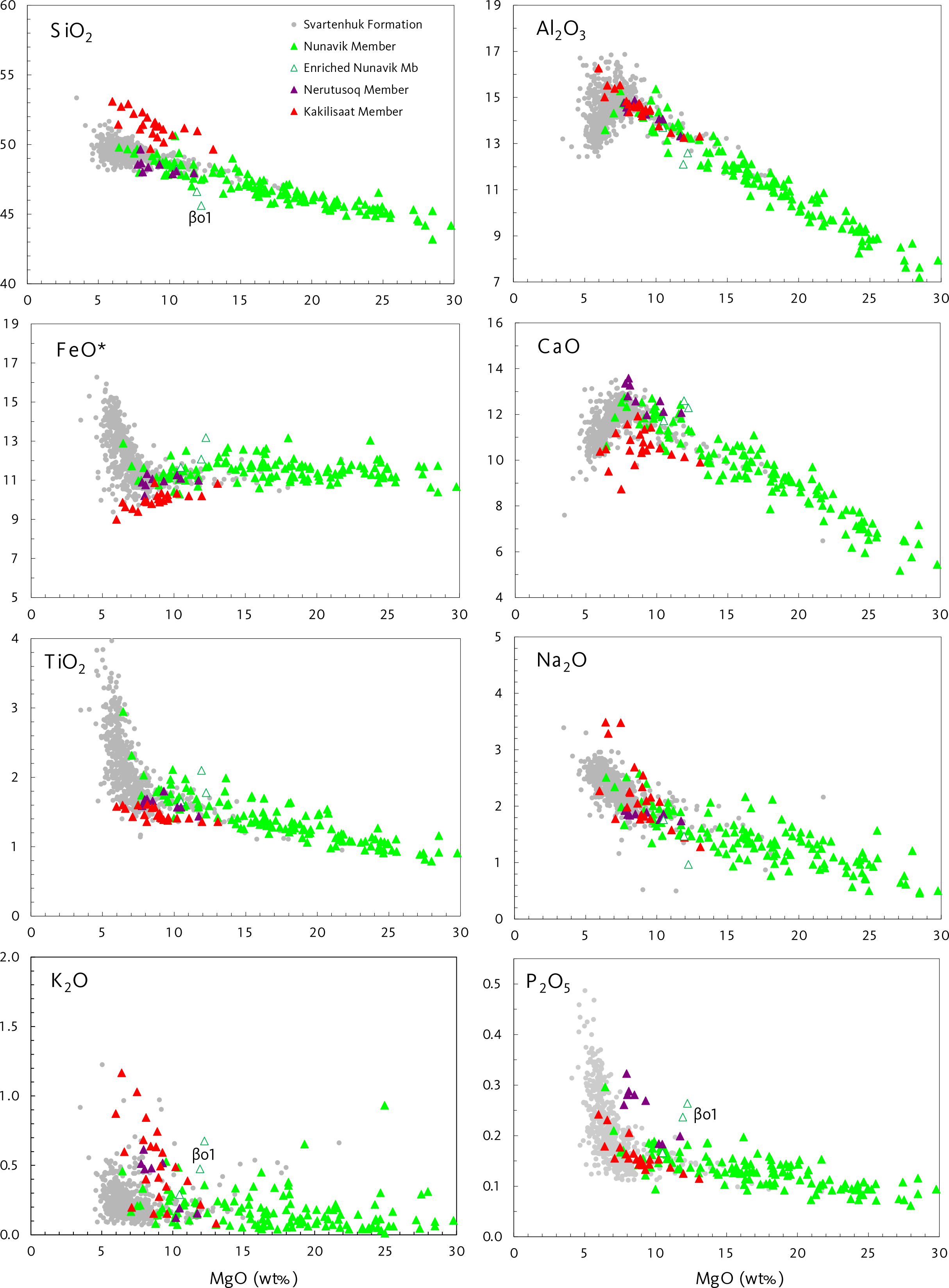 The Nunavik Member is dominated by picrites. The total MgO range is 6.4–29.8 wt% MgO, and the average MgO content of 130 analyses is 17.5 wt% MgO, which is probably not far from the parental magma composition (Larsen & Pedersen 2000, 2009; Herzberg & O’Hara 1998, 2002; Herzberg et al. 2007). The well-defined trends, particularly in the major-element diagrams (Fig. 72), are caused by olivine fractionation and accumulation, as already noted by Clarke (1970). When the fractionating magma reached 7–8 wt% MgO, plagioclase started to crystallise, which removed CaO and Al2O3 from the magma. Figure 72 shows that most of the magmas of the Nunavik Member did not reach the stage of plagioclase fractionation, with the βo2 basalt marker flow near the top of the member as an exception (6.4 wt% MgO, 13.6 wt% Al2O3, 10.6 wt% CaO and 2.9 wt% TiO2). A couple of samples with low CaO also have high SiO2 and are crustally contaminated. Relatively scattered K2O contents are due to secondary alteration.