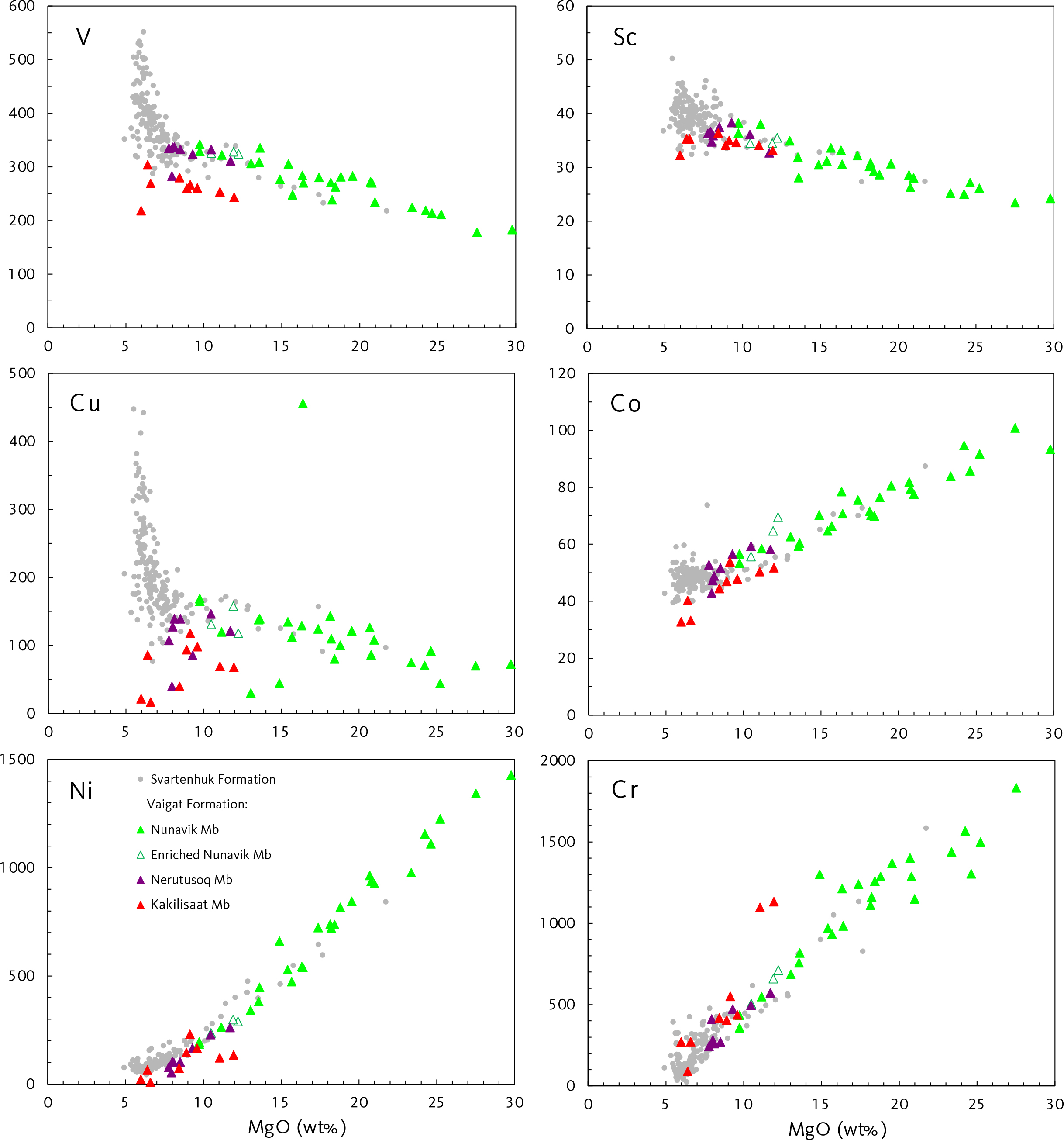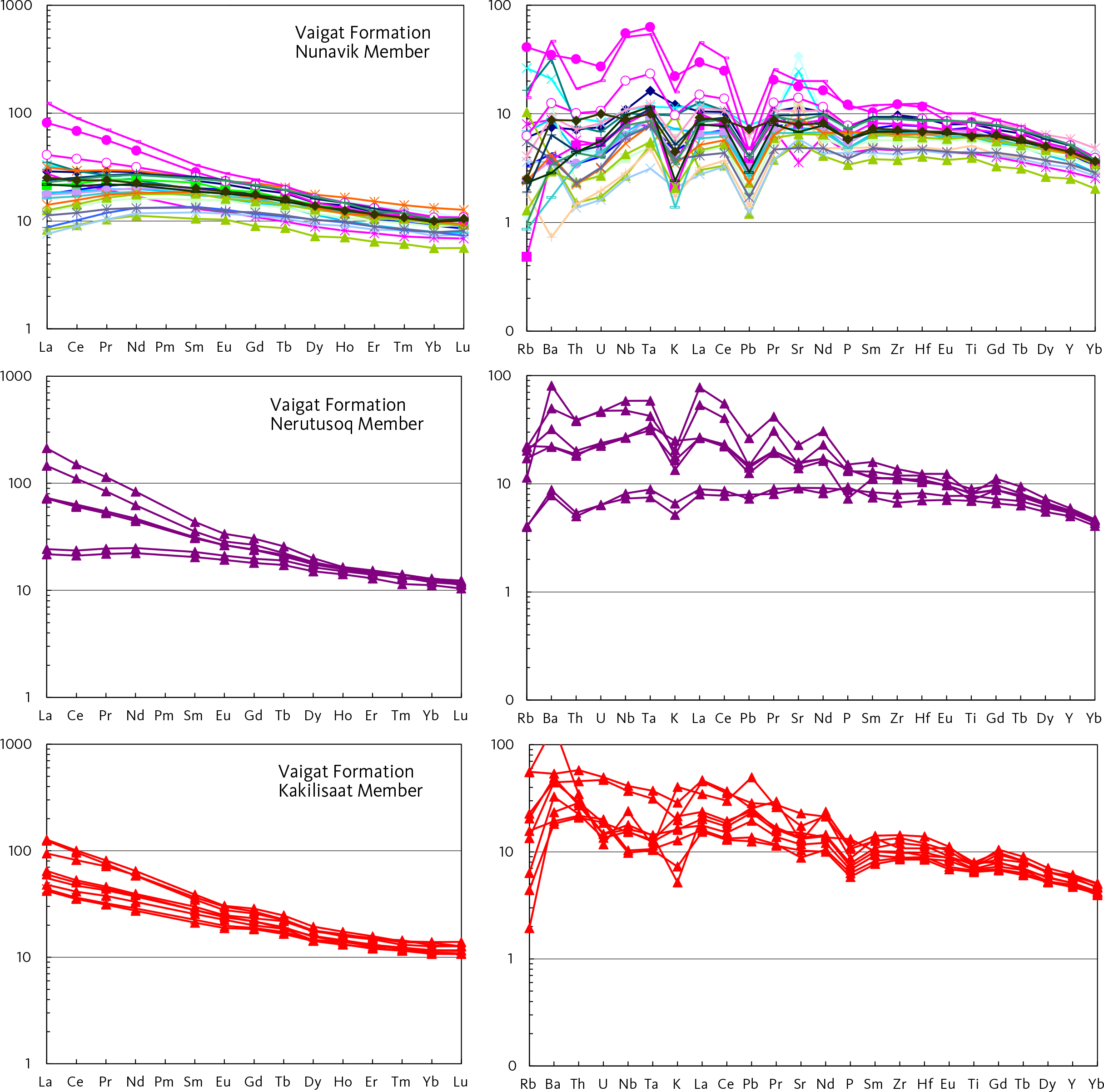 In total, about 900 samples were analysed for major elements and 300 for trace elements. From the Vaigat Formation, 166 samples were analysed for major elements and 48 for trace elements. From the Svartenhuk and Naqerloq Formations, 720 samples were analysed for major elements and 233 for trace elements. Twenty dyke samples were analysed for major elements and 14 for trace elements. All analytical data are available in Supplementary file S4.