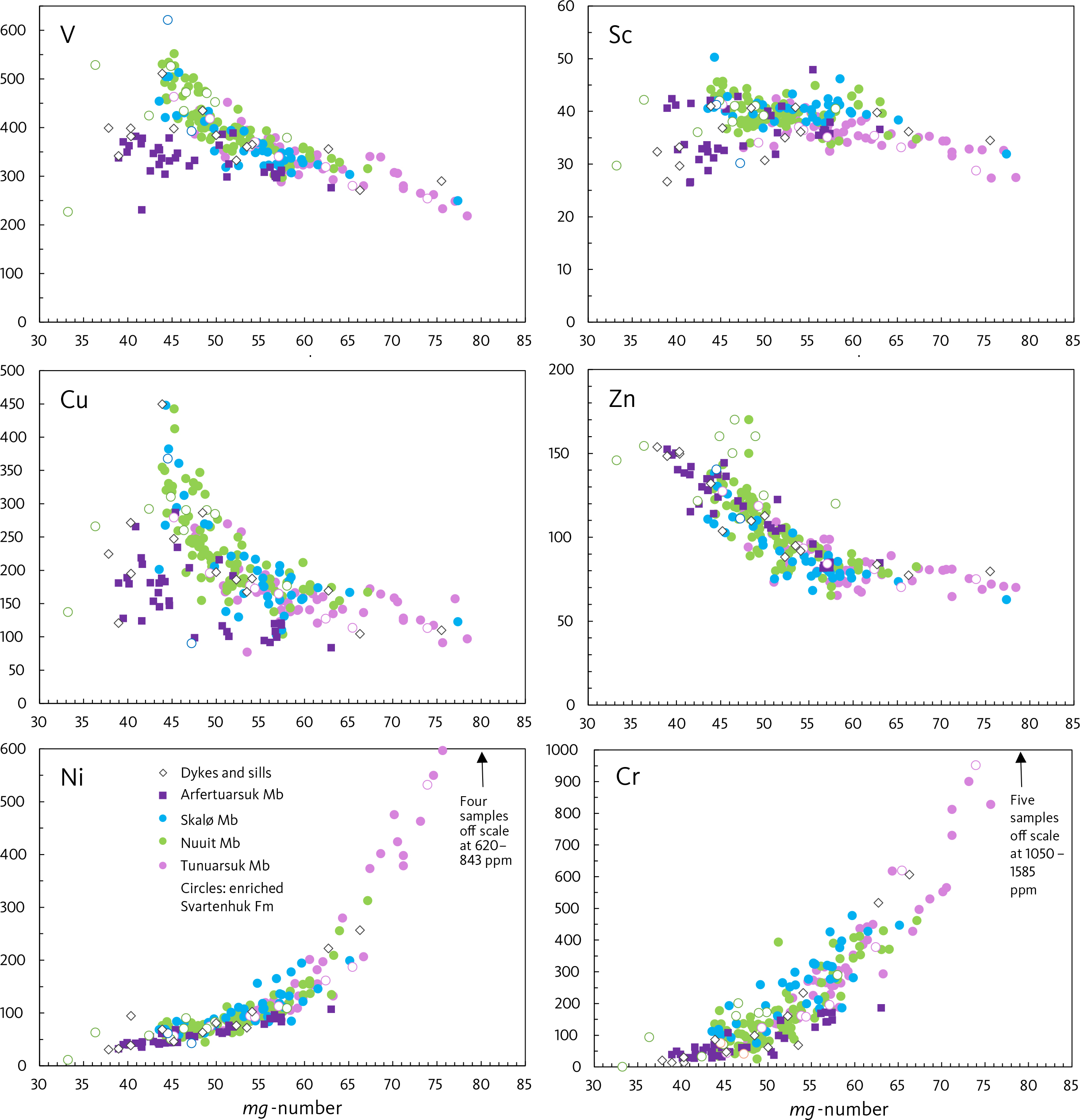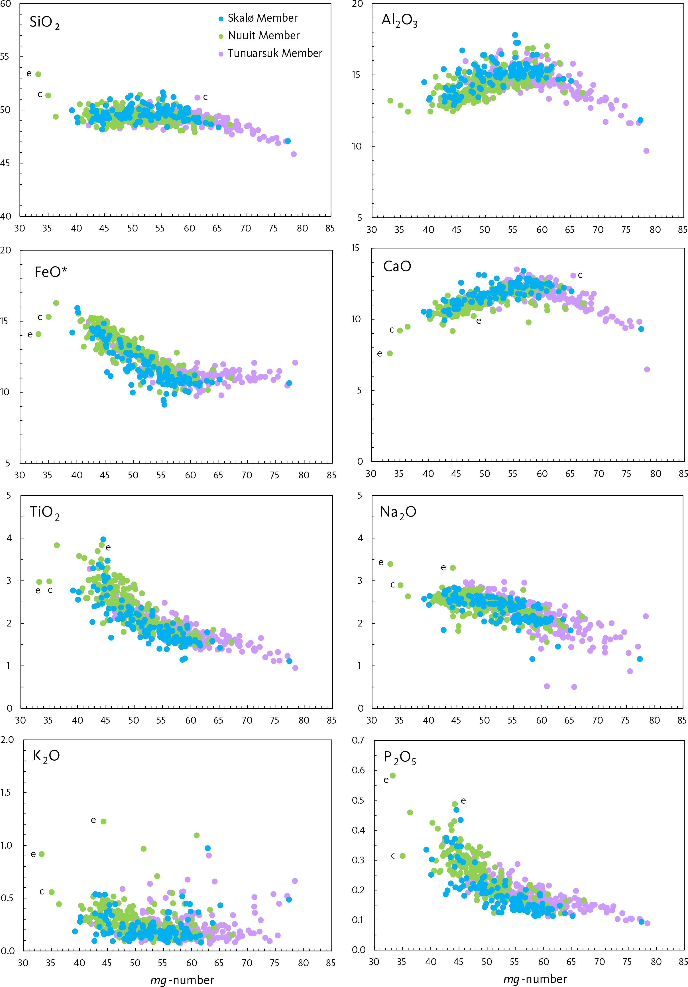 The Tunuarsuk Member contains a significant component of picrites (with mg-numbers > c. 68), which the two younger members do not. This may be a result of decreasing magma production rates with time and thus longer residence times in the magma chambers. The very evolved lava flows on top of the Skalø Member on Aputituut (profile 55) mentioned above may be interpreted as the products of prolonged fractionation in a dying magma chamber that was no longer replenished from deeper levels.