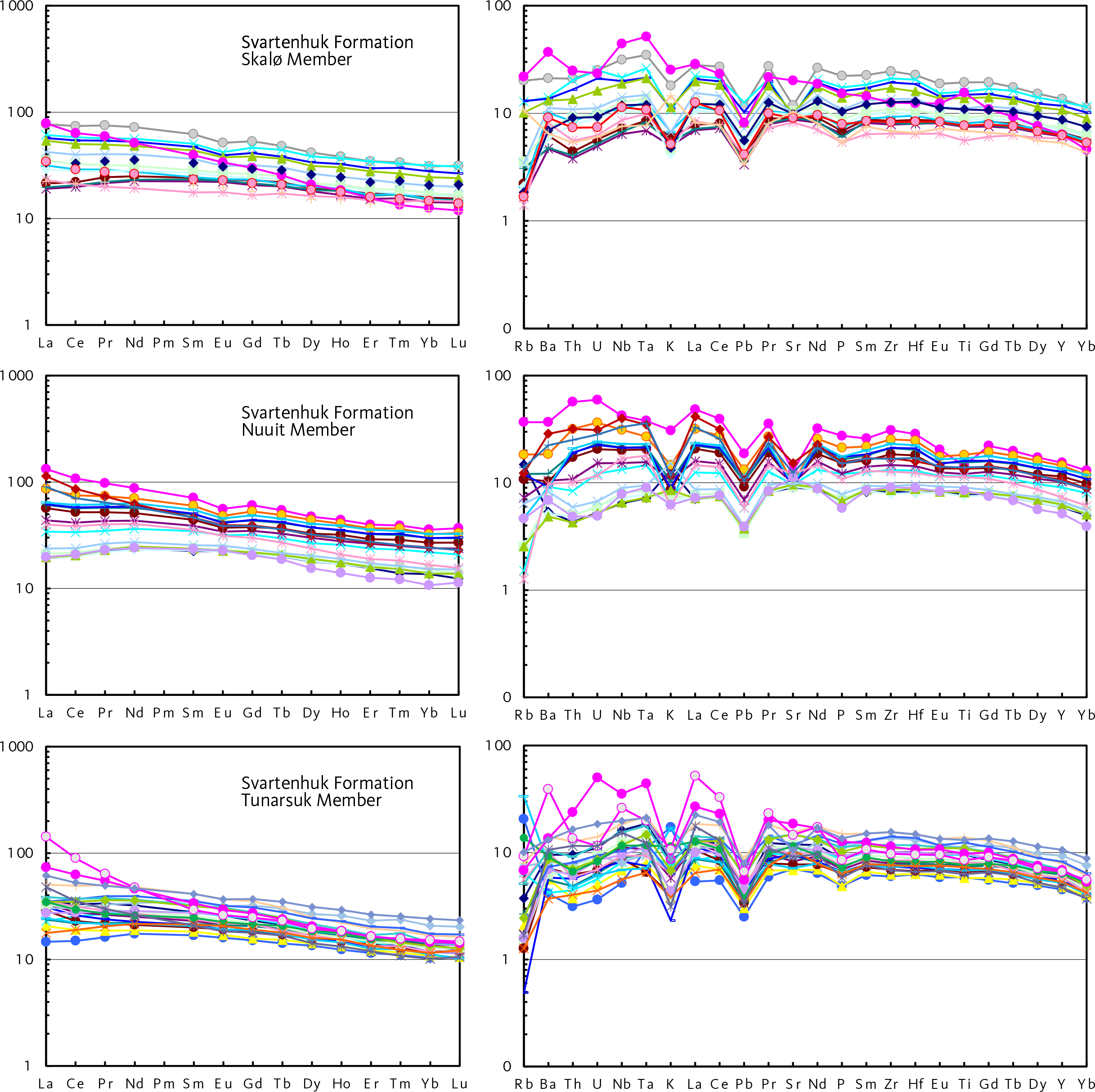 The three volcanic members of the Svartenhuk Formation are compositionally very similar in their major and trace elements, and what defines the chemostratigraphy is the pattern of variation up-section. For example, the major difference between the Skalø and Nuuit Members is the variable TiO2 compositional profiles in the Nuuit Member compared to the near-constant profiles in the Skalø Member (Fig. 42).