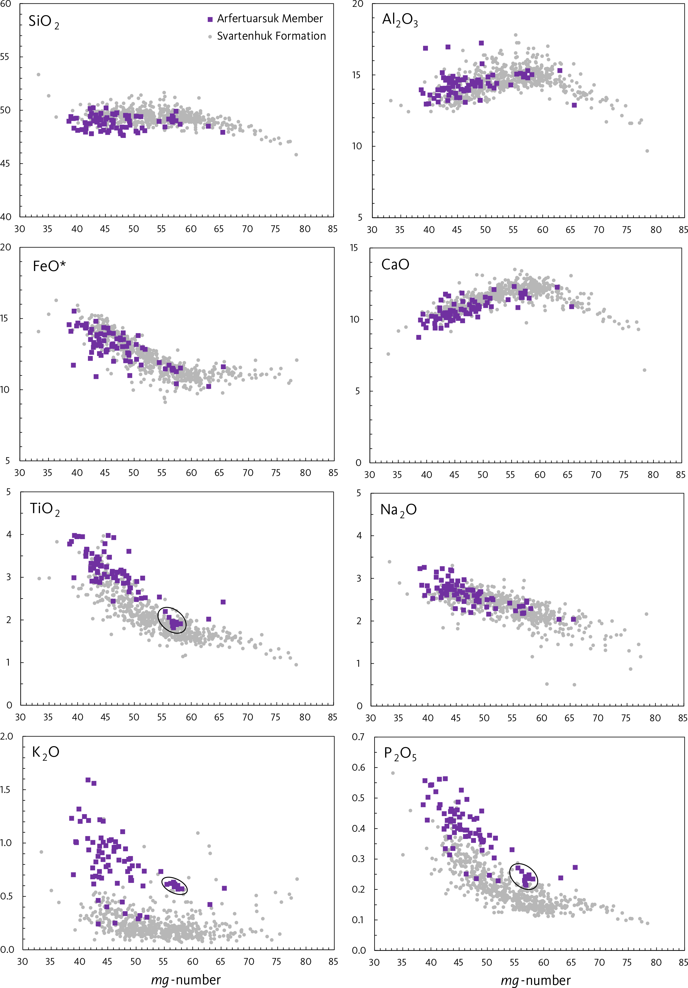 The Arfertuarsuk Member basalts have 3.8–8.6 wt% MgO with an average of 5.8 wt% MgO. TiO2 is in the range 1.8–4.0 wt%, and the average TiO2 content is 3.0 wt% (79 analyses). The member is thus on average slightly more evolved to lower MgO and higher TiO2 contents than the basalts of the Svartenhuk Formation, though there are large compositional overlaps for these elements (Fig. 80). K2O and P2O5 contents are notably high, with averages of 0.80 wt% K2O and 0.39 wt% P2O5 compared to the Svartenhuk Formation with averages of 0.24 wt% K2O and 0.21 wt% P2O5; there are only small compositional overlaps for these elements (Fig. 80). The P2O5/TiO2 ratio is useful for distinguishing samples that have not been analysed for trace elements because this ratio is on average 0.10 ± 0.01 for the Svartenhuk Formation and 0.13 ± 0.01 for the Arfertuarsuk Member.